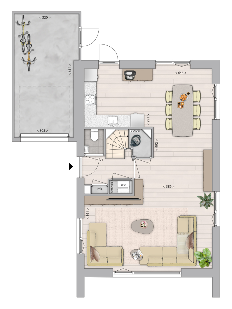 Even binnenkijken? Via de voordeur aan de zijkant stap je in de hal met toegang tot het toilet, meterkast, technische ruimte, deur naar de woonkamer en trap naar de 1e verdieping. Het woongedeelte is een open ruimte met plek voor een fijne leefkeuken met openslaande deur naar de achtertuin. Creëer aan de voorkant een lekkere zithoek en vanuit je grote raam kijk je uit op de riante tuin. Heerlijk, niet? In de aangebouwde stenen berging heb je ruimte voor een extra koelkast of de fietsen, handig!
