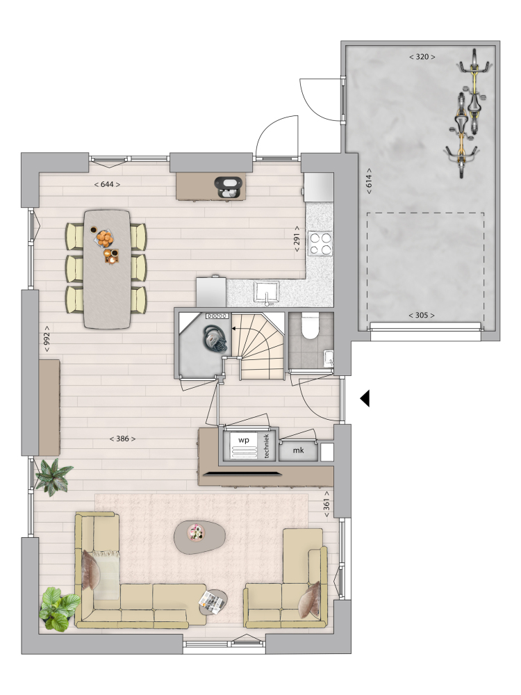 Even binnenkijken? Via de voordeur aan de zijkant stap je in de hal met toegang tot het toilet, meterkast, technische ruimte, deur naar de woonkamer en trap naar de 1e verdieping. Het woongedeelte is een open ruimte met plek voor een fijne leefkeuken met openslaande deur naar de achtertuin. Creëer aan de voorkant een lekkere zithoek en vanuit je grote raam kijk je uit op de riante tuin. Heerlijk, niet? In de aangebouwde stenen berging heb je ruimte voor een extra koelkast of de fietsen, handig!
