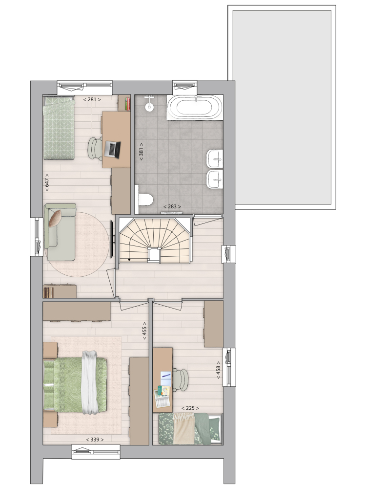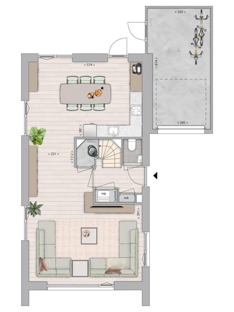 Let op: het door de ontwikkelaar opgegeven gebruiksoppervlak kan afwijken van het daadwerkelijke woonoppervlak! Bij het gebruiksoppervlak kunnen ook bergzolders, bergingen of andere ruimten zijn gerekend, terwijl deze volgens de NEN2580 niet als woonoppervlak zijn aan te merken. Afhankelijk van de mogelijkheden kunt u bijvoorbeeld voor een bergzolder een dakraam toepassen, waardoor deze ruimte eventueel alsnog als woonoppervlak kan worden gerekend. Vraag de makelaar voor meer informatie en eventuele mogelijkheden.