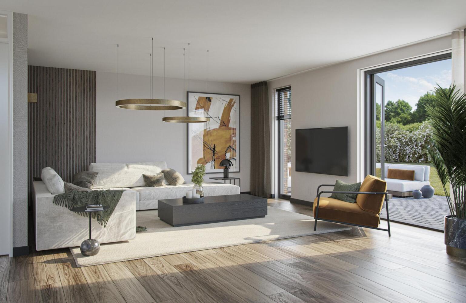 - Royale woonkamer en keuken met uitzicht op achter- zij- en voortuin.