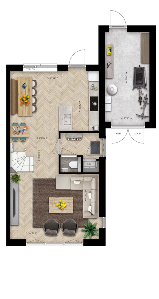 Je komt binnen via de zij-entree en geniet direct van de lichte begane grond, want de grote ramen tot aan de grond zorgen voor veel natuurlijke lichtinval. De woonkamer ligt aan de voorzijde en de open keuken is gesitueerd aan de achterzijde, verbonden met de diepe achtertuin.