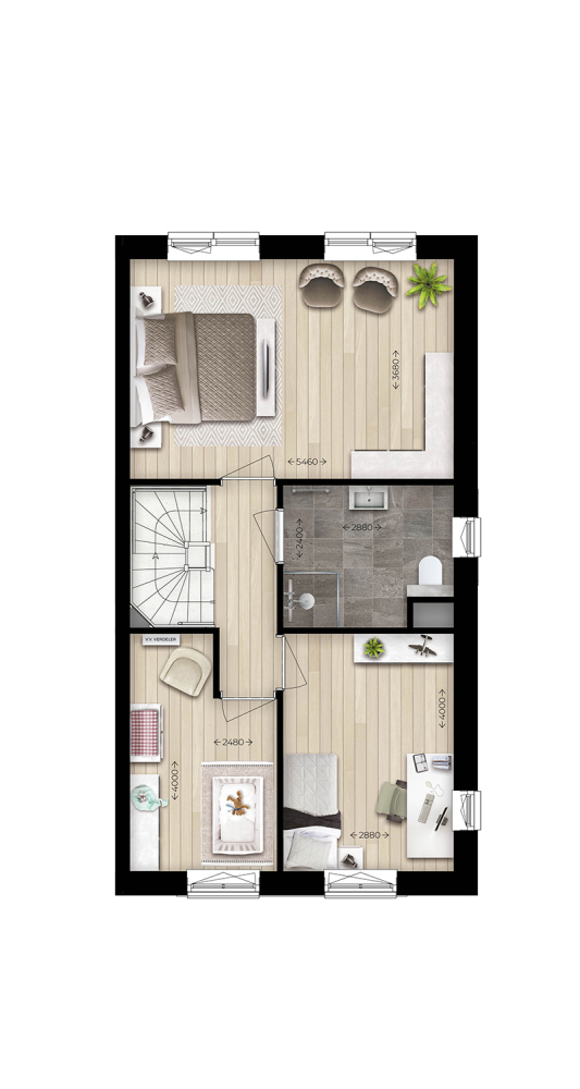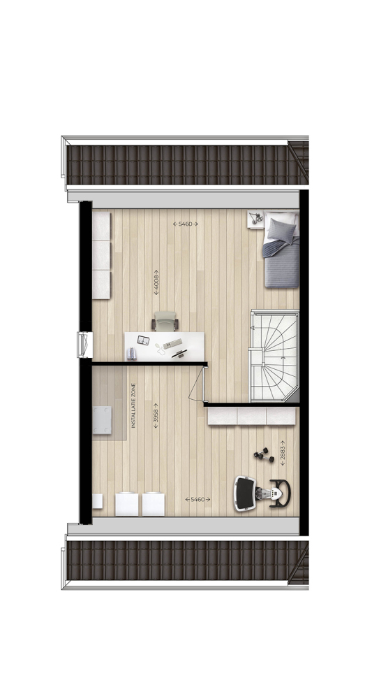Tweede verdieping met vele mogelijkheden door de hoogte en ramen in de voor- en achtergevel. Naar wens in te delen, bijvoorbeeld met een vierde slaapkamer of een fijne werkkamer om thuis te kunnen werken. Separate technische ruimte met warmtepomp, mechanische ventilatie, warmte terugwinningssysteem en opstelling voor wasmachine en -droger