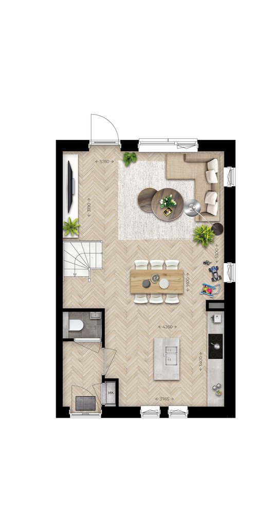 Via de hal kom je binnen in de zeer ruime woonkamer en open keuken. Door de woningbreedte van 6 meter heb je alle ruimte voor bijvoorbeeld een kookeiland en een grote loungebank. Bouwnummer 74 en 77 hebben door de zij-uitbouw nóg meer ruimte. Vanuit het woongedeelte aan de achterzijde loop je de fijne achtertuin in. Bij bouwnummer 74, 75 en 76 is deze georiënteerd op het zuiden/zuidwesten. Bij bouwnummer 77 is de achtertuin georiënteerd op westen.