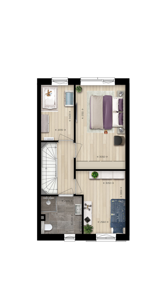 Loop je de trap op, dan tref je 3 slaapkamers en de badkamer aan. Complete badkamer met wandcloset, inloopdouche, wastafel en raam.