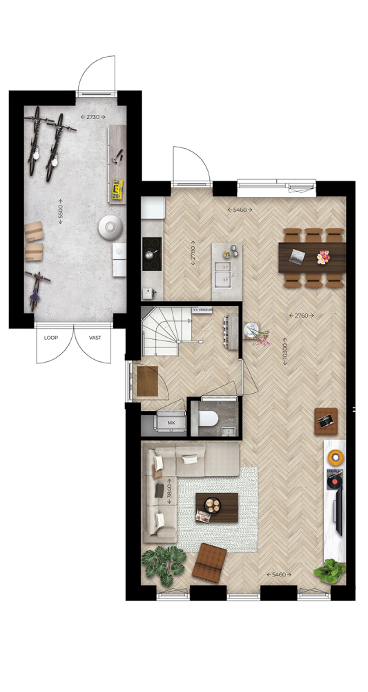 Ruime woonkamer aan de voorzijde met veel lichtinval door grote raampartijen. Speelse keuken met eilandopstelling mogelijk. Aangebouwde ruime berging met openslaande deuren.