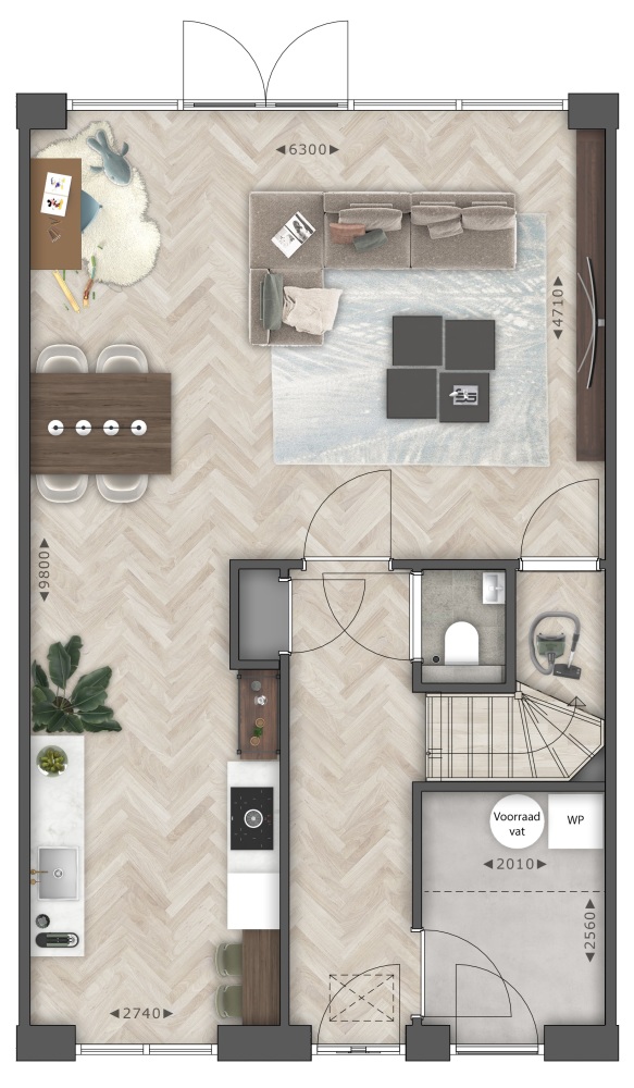 Aan de voorzijde van de woning is de keuken gesitueerd. Er is in de koopsom een bedrag inbegrepen voor een keuken, die je straks helemaal zelf kan uitzoeken.