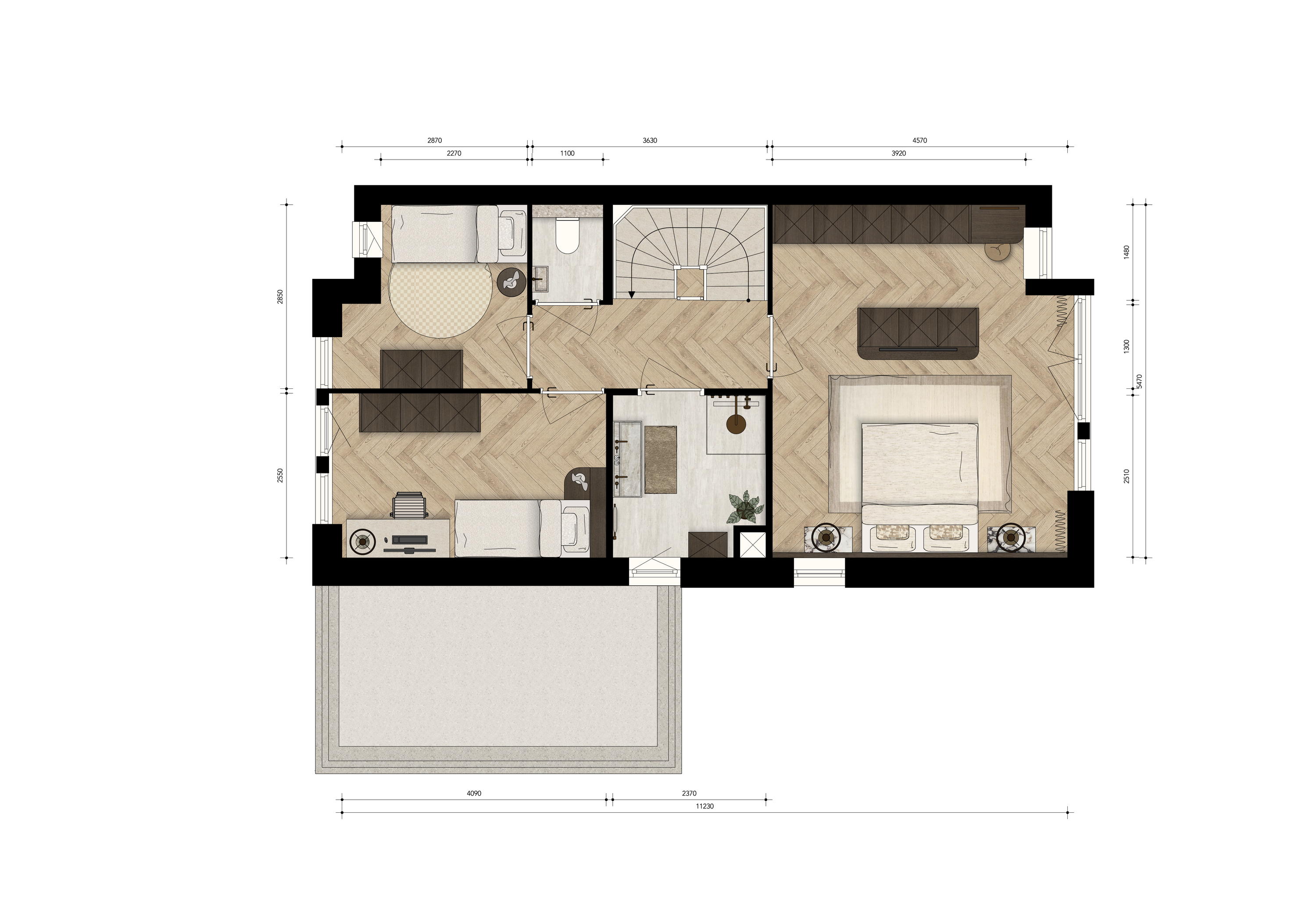 Vanuit de living of keuken is er een directe doorgang naar de riante, aangebouwde berging. Het deels betrekken van deze berging bij de woonkamer of keuken om zo nog meer leefruimte te creëren behoort ook tot de mogelijkheden. De eerste verdieping biedt ruimte aan een grote master bedroom, twee grote slaapkamers aan de achterzijde, een badkamer en een toilet. Op de tweede verdieping is ruimte voor het creëren van nog 1 of 2 slaap-, werk-, of hobbykamer(s). Ook vind u hier de technische ruimte met de duurzame installaties en aansluitingen voor een wasmachine en -droger.