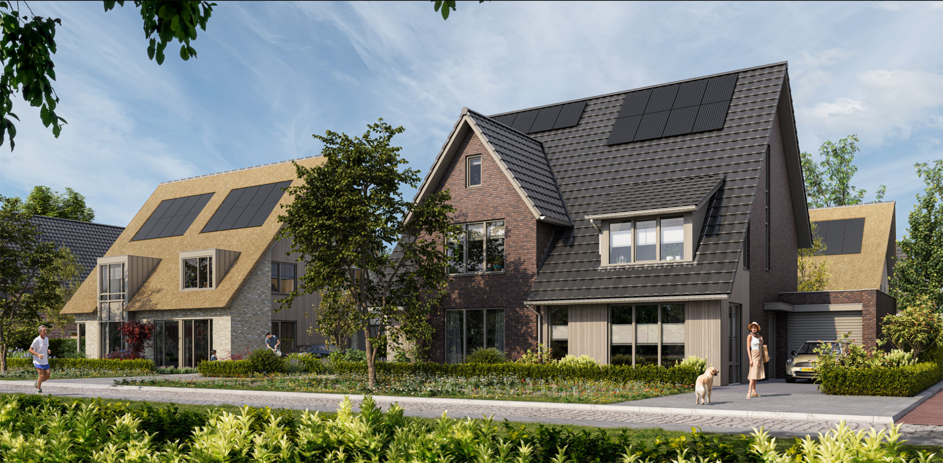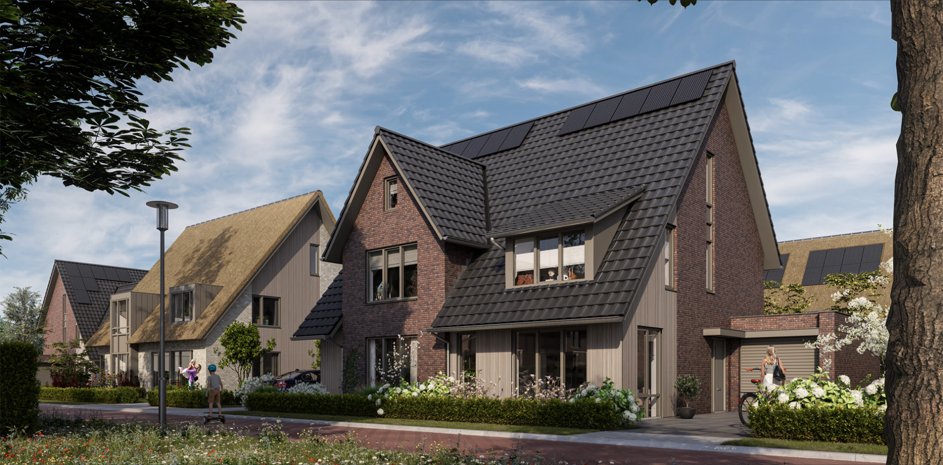 een verscheidenheid aan woningtypen. Hier zijn vrijstaande woningen en tweekappers gerealiseerd, geïnspireerd door traditionele landelijke bouwstijlen, maar met een moderne twist. De grote kappen en natuurlijke materialen geven de woningen een stoere, eigentijdse uitstraling. De openheid van het landschap en de verbinding met de centrale waterpartij zorgen voor een aangename leefomgeving.