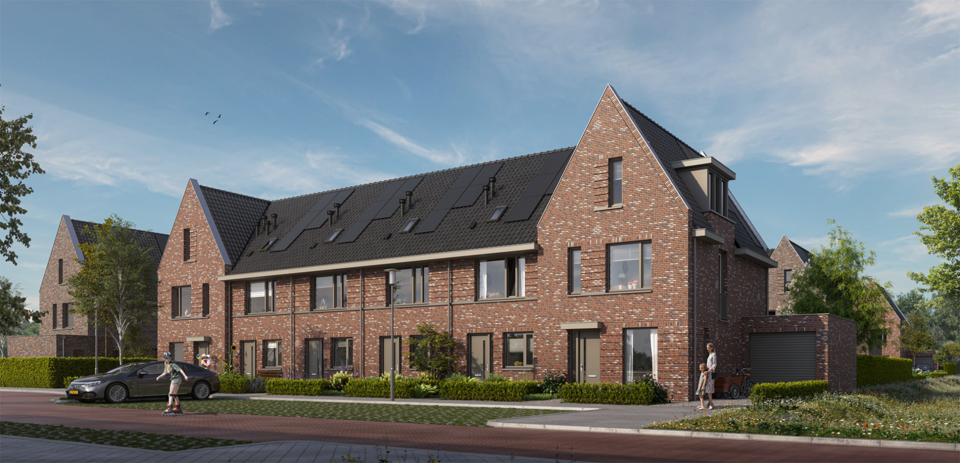 een verscheidenheid aan woningtypen. Hier zijn vrijstaande woningen en tweekappers gerealiseerd, geïnspireerd door traditionele landelijke bouwstijlen, maar met een moderne twist. De grote kappen en natuurlijke materialen geven de woningen een stoere, eigentijdse uitstraling. De openheid van het landschap en de verbinding met de centrale waterpartij zorgen voor een aangename leefomgeving.