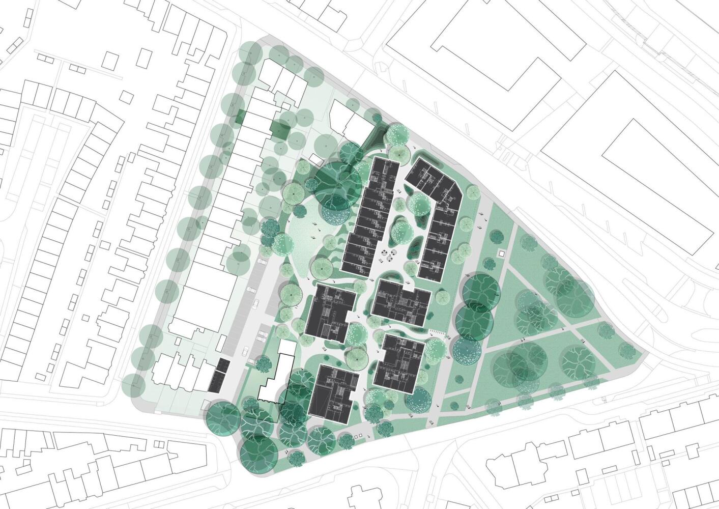 De ontmoetingsruimte wordt een plek waar bewoners en buurtgenoten activiteiten organiseren of gezellig langsgaan voor een kopje koffie. Parkeren kan in de ondergrondse parkeergarage. Tussen de woongebouwen vind je de de gezamenlijke binnentuinen die een oase van rust bieden. Extra bomen en planten leveren een bijdrage aan de biodiversiteit. Het groen wordt een echte verbinder en de ideale plek voor een gezellig buitenleven.