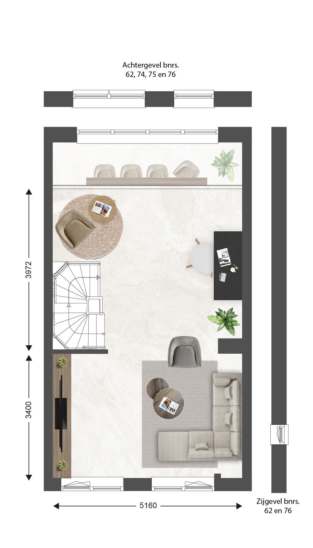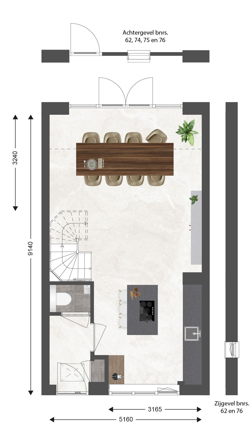 • Bnr. 63 t/m 70, 73 t/m 75 met achtertuin op het zuiden