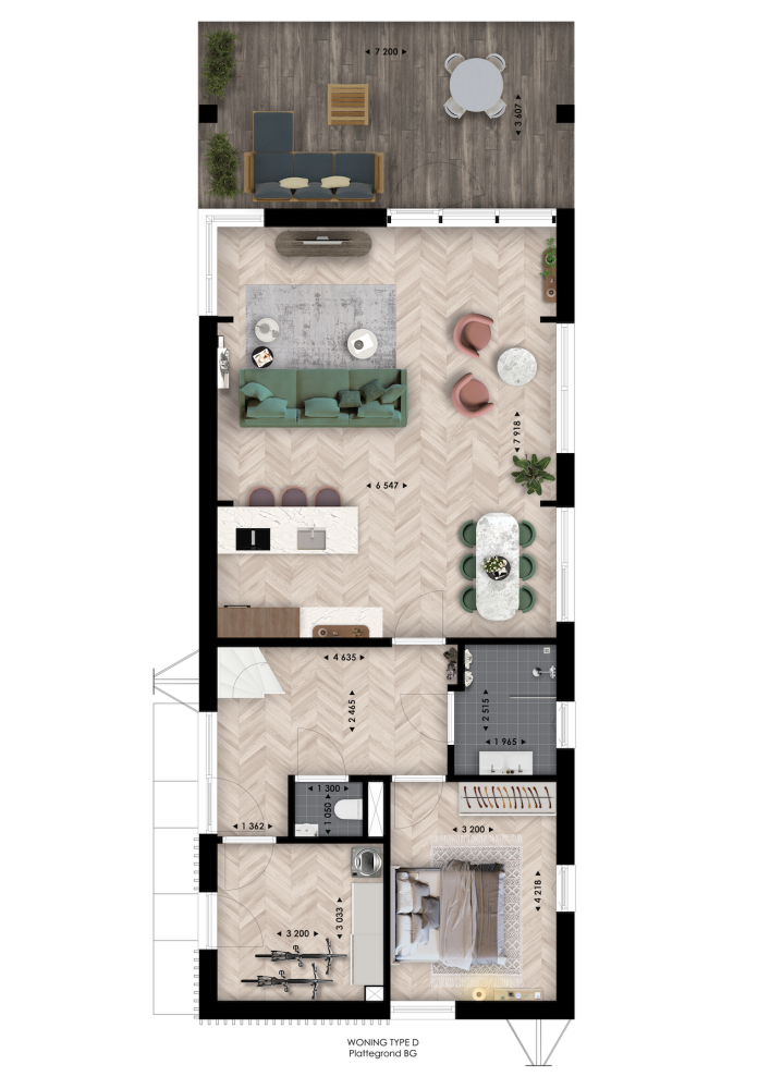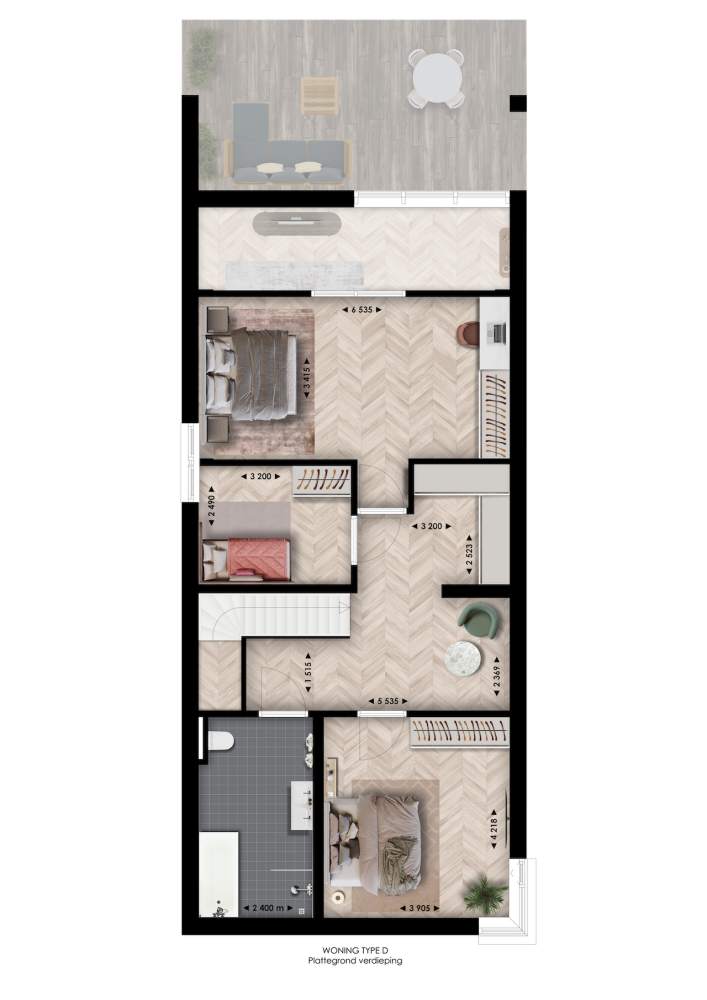 In woningtype D woon je verrassend ruim dankzij de vide, slimme indeling en grote raampartijen. De woning is ontworpen met oog voor de toekomst: comfortabel gelijkvloers wonen met de mogelijkheid om ruimtes flexibel in te delen. Denk aan het samenvoegen van slaapkamers, het toevoegen van een werkhoek of het realiseren van een balkon met prachtig uitzicht over het water.