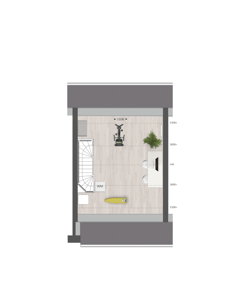 De tweede verdieping biedt je een zee aan ruimte. Hier vind je de aansluitingen voor de wasapparatuur en heb je eventueel de mogelijkheid om een aparte wasruimte te maken en een thuiskantoor of extra slaapkamer met dakkapel aan de voor- én/of achterzijde.