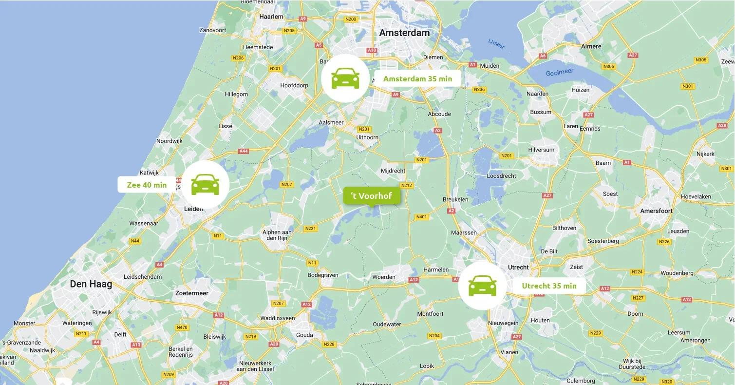 Daarnaast heeft u de voorzieningen van de gemeente Nieuwkoop binnen handbereik. Voor de kinderen zijn er basisscholen in het dorp en de middelbare scholen bevinden zich op fietsafstand in Nieuwkoop en Mijdrecht. Ook op sportief gebied biedt de omgeving u volop keuzemogelijkheden. In de nabijheid van ’t Voorhof vindt u veel watersportmogelijkheden, een golfbaan en diverse sportaccommodaties, waaronder een voetbal- en een tennisvereniging. Ook bent u binnen een half uur in Utrecht, Leiden en Amsterdam. Kortom, een unieke locatie met alle mogelijkheden die u maar wenst binnen handbereik.
