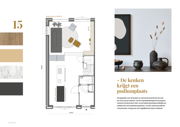 Bouwnummer 15 is een hoekwoning, net als bouwnummer 18. Deze woningen zijn elkaars spiegelbeeld. Het verhoogde keukengedeelte voelt als een podium, perfect voor een eettafel bij een kookeiland. Bovendien heb je alle vrijheid om jouw ideale keuken naar wens samen te stellen.