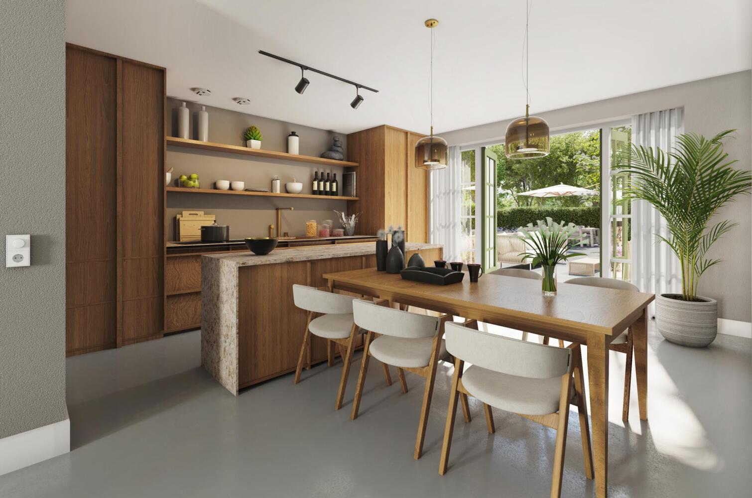 Vanuit de woonkamer heb je zicht op het gezellige nieuwe straatje. De woonkeuken bevindt zich aan de achterkant en vanaf hier biedt toegang tot de achtertuin.