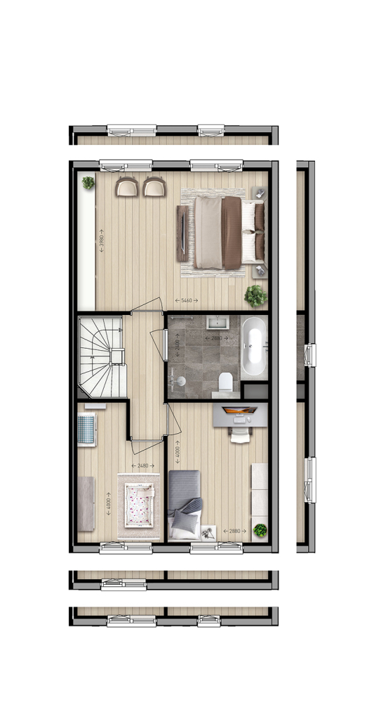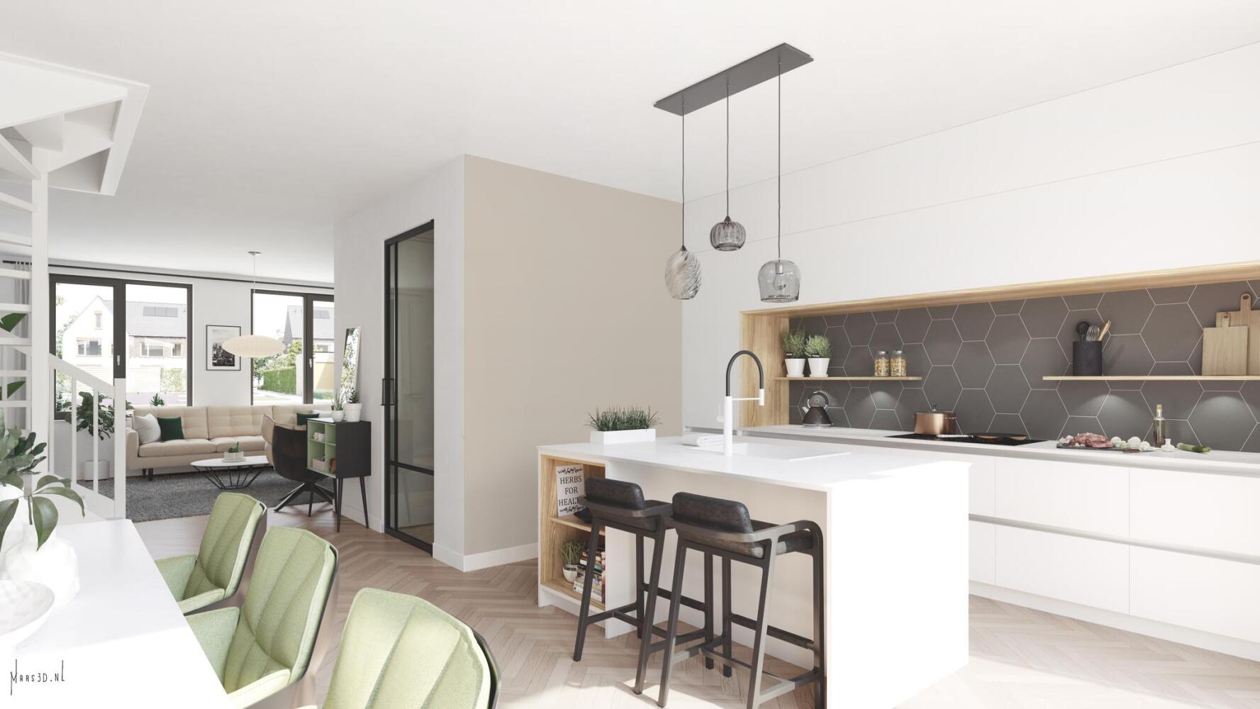 Je betreedt de woning via de zij-entree. Vanuit de ruime woonkamer en open keuken kijk je mooi uit over de tuin en het groene hofje aan de voorzijde. De grote raampartijen zorgen voor veel natuurlijke lichtinval. De eerste verdieping heeft 3 slaapkamers en een luxe badkamer met wasbak, inloopdouche en toilet. De tweede verdieping is vrij indeelbaar, creëer hier bijvoorbeeld een extra slaapkamer of kantoorruimte om fijn vanuit huis te werken.