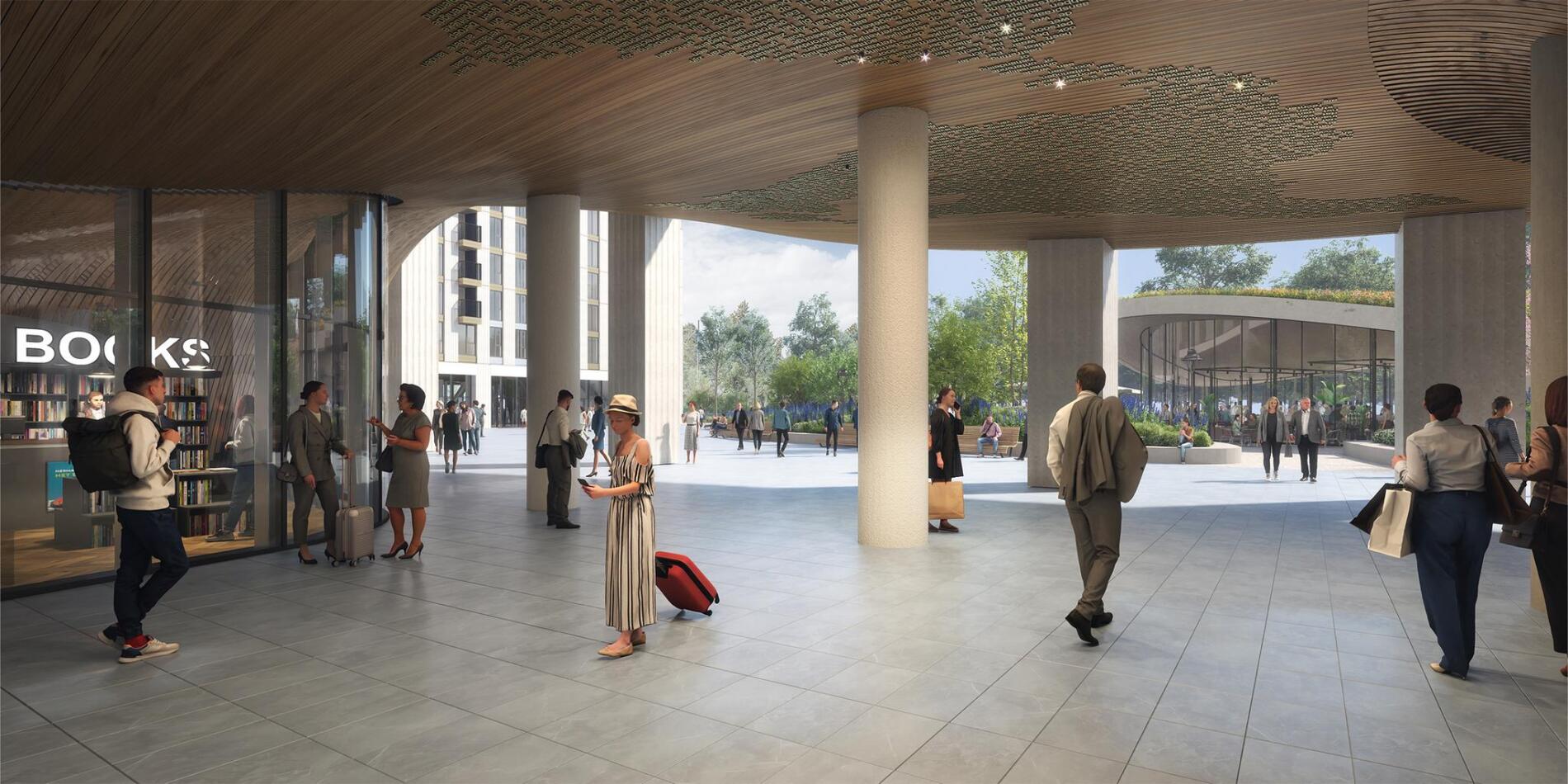 De warm verlichte gewelven van de openbare ruimte onder de torens vormen een omgekeerd duinlandschap waarop straks de Universele Rechten van de Mens worden getoond. Deze ruimte is de verbinding tussen het vernieuwde Centraal Station en het uitgestrekte groene park. Het geeft u direct het gevoel dat u deel uitmaakt van dé stad achter de duinen, waar met alle inspanningen de rechten van de mens worden beschermd. Hier komen vele nationaliteiten samen en vinden zij hun weg naar alle overheidsgebouwen, NGO’s en ambassades. Omgekeerd is KJ straks ook een ideale plek om te wonen voor mensen die een snelle verbinding willen met bijvoorbeeld Brussel, Parijs en Londen. Met alle internationale treinverbindingen bent u er zo. Maar vliegen vanaf Schiphol of Rotterdam-The Hague airport is ook snel geregeld.