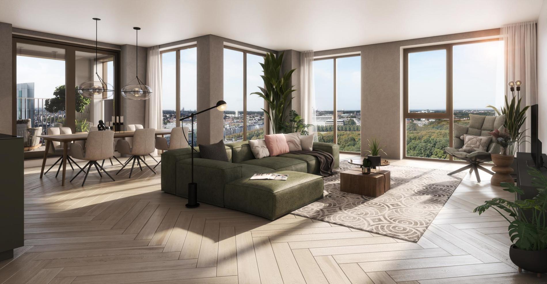 In de appartementen in de voet van het gebouw maakt u deel uit van de gezellige stadse levendigheid. Er zijn diverse boetiekjes, lunchtentjes en restaurants in de directe omgeving. U kunt er terecht voor een snelle lunch met zakenrelaties of juist een lange lunch met vrienden. In de zomer geniet u bij het Stadspaviljoen met een goede kop koffie in de hand van de voorbijgangers die zich naar het Centraal Station haasten. Vanuit uw appartement kijkt u heel ontspannen uit over het uitgestrekte nieuwe groene park. Vanaf de historische Koekamp vlakbij tot aan de Scheveningse bosjes in de verte.