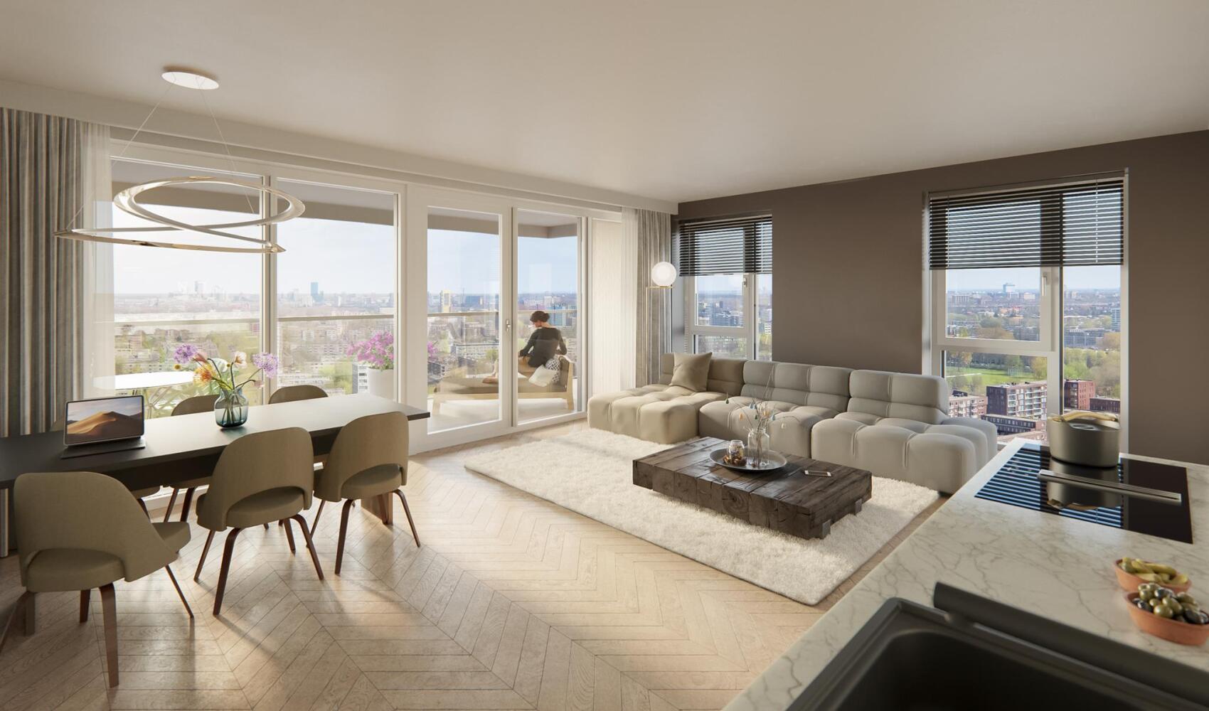 Indeling: entree/hal met toilet en interne berging waar ook wasmachine aansluiting is. Slaapkamer 1 is circa 11,5m² en slaapkamer 1 is ruim 10m². De badkamer wordt voorzien van een douche en wastafel. De ruime woonkamer met open keuken van ruim 25m² grenst aan het balkon van ruim 13m² met bij de hoger gelegen verdiepingen uitzicht richting het centrum van Den Haag.