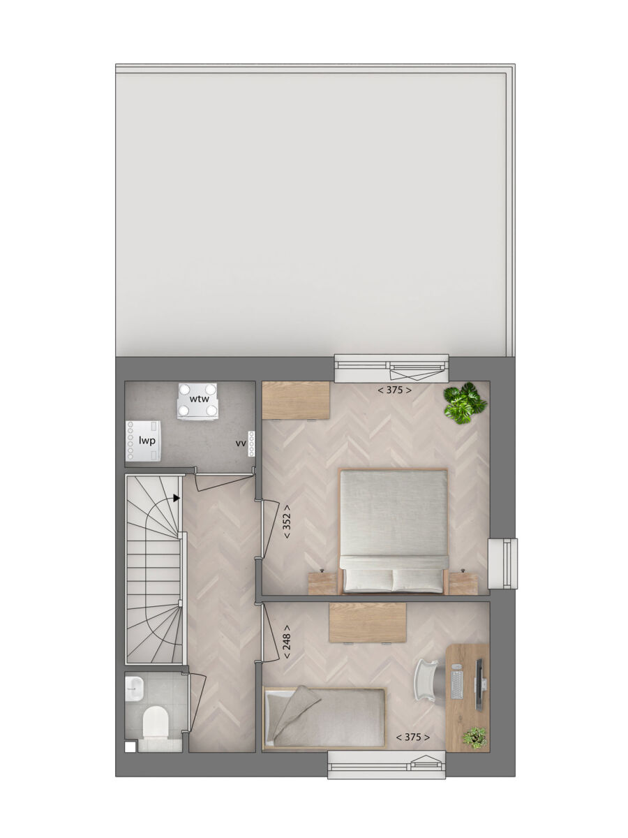 Je komt deze woning binnen in de entreehal, met het toilet en de trapopgang naar boven. Voordat je naar boven gaat, eerst een rondje beneden. Want kijk die langgestrekte leefruimte eens! Hier komt het daglicht door de grote en hoge ramen aan weerszijden prettig binnen en blijf je dankzij de open indeling altijd met elkaar in contact, ook tijdens het koken. Voorin is plek voor de zithoek, achterin loop je via de keuken door naar de tuin. Ook vind je hier de slaapkamer met plek voor een tweepersoonsbed en toegang tot de badkamer, voorzien van wastafel en douche. De 1e verdieping beschikt over 2 extra slaapkamers, de technische ruimte en een aparte ruimte waar je de wasmachine en droger kwijt kunt. En met dat platte dak benut je ook hier alle vierkante meters optimaal.