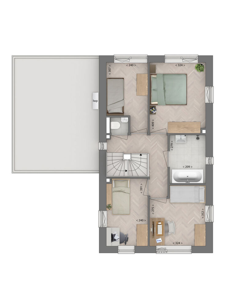 Via de eigen oprit bereik je de aangebouwde berging en de voordeur van deze vrijstaande woning. Na de ruime hal ontvouwt zich een royale U-vormige leefruimte. Voorin een sfeervolle zithoek, achterin de open keuken met schiereiland en volop plek voor een grote eettafel. Openslaande deuren aan de zij- en achterkant zorgen voor een sterke verbinding met de tuin. Achter de keuken ligt een praktische bijkeuken, ideaal voor voorraad en spullen die je liever uit het zicht bewaart. Op de eerste verdieping vind je 4 slaapkamers, een luxe badkamer met ligbad, douche, wastafel en daglicht, en een separaat toilet. De tweede verdieping is dankzij het dakraam licht en heeft naast de technische ruimte, met plek voor de wasmachine en droger, nog veel meters vrij om zelf in te delen. Wordt het een werkplek, speelzolder of logeerkamer? Alles kan!