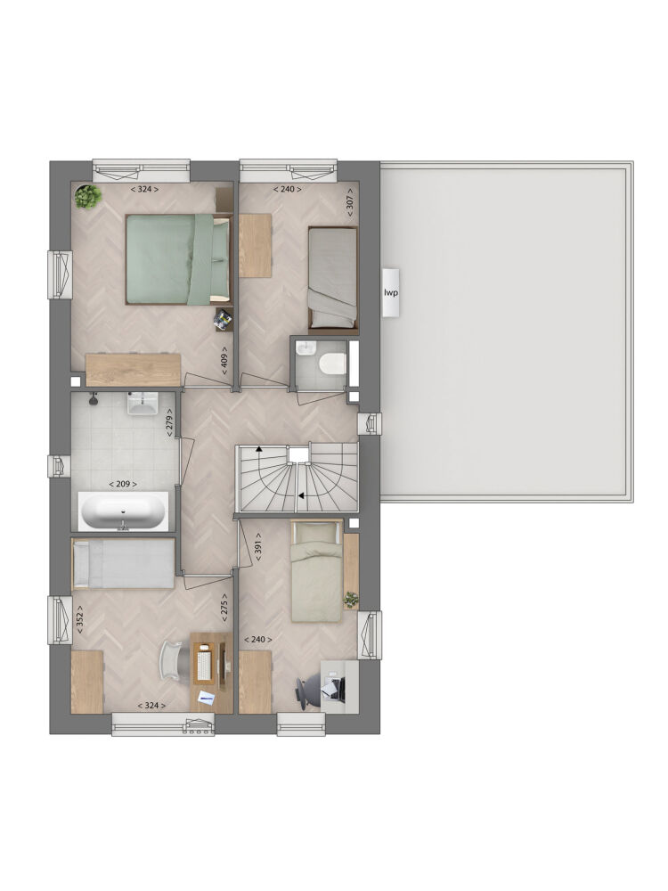 Via de eigen oprit bereik je de aangebouwde berging en de voordeur van deze vrijstaande woning. Na de ruime hal ontvouwt zich een royale U-vormige leefruimte. Voorin een sfeervolle zithoek, achterin de open keuken met schiereiland en volop plek voor een grote eettafel. Openslaande deuren aan de zij- en achterkant zorgen voor een sterke verbinding met de tuin. Achter de keuken ligt een praktische bijkeuken, ideaal voor voorraad en spullen die je liever uit het zicht bewaart. Op de eerste verdieping vind je 4 slaapkamers, een luxe badkamer met ligbad, douche, wastafel en daglicht, en een separaat toilet. De tweede verdieping is dankzij het dakraam licht en heeft naast de technische ruimte, met plek voor de wasmachine en droger, nog veel meters vrij om zelf in te delen. Wordt het een werkplek, speelzolder of logeerkamer? Alles kan!
