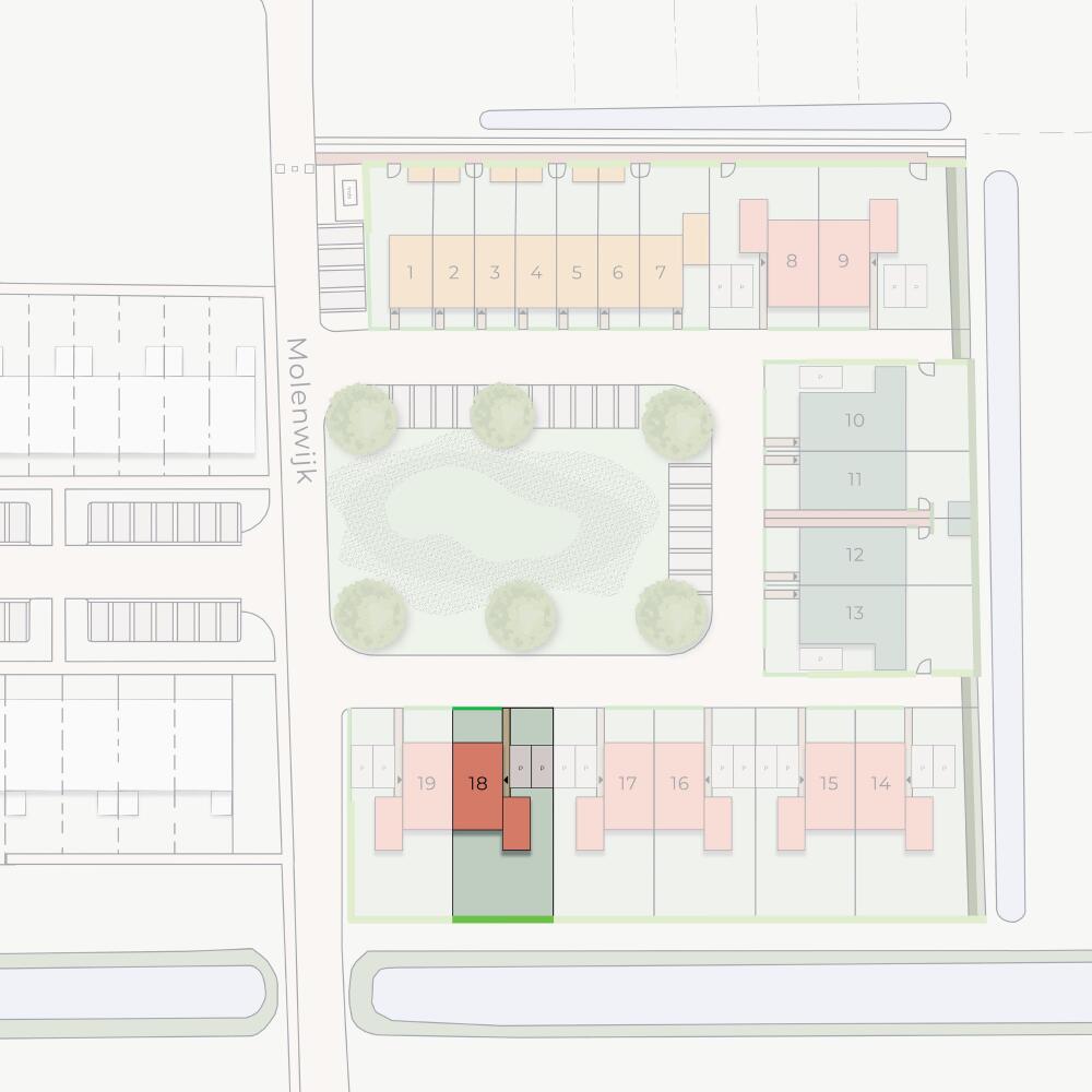 De wijk met 19 koopwoningen heeft een speelse opzet en sluit naadloos aan op de bestaande buurt. De woningen hebben een warme, tijdloze uitstraling door de combinatie van metselwerk en hout. Met uitzicht op het groene hart van de wijk kunnen kinderen zorgeloos spelen.