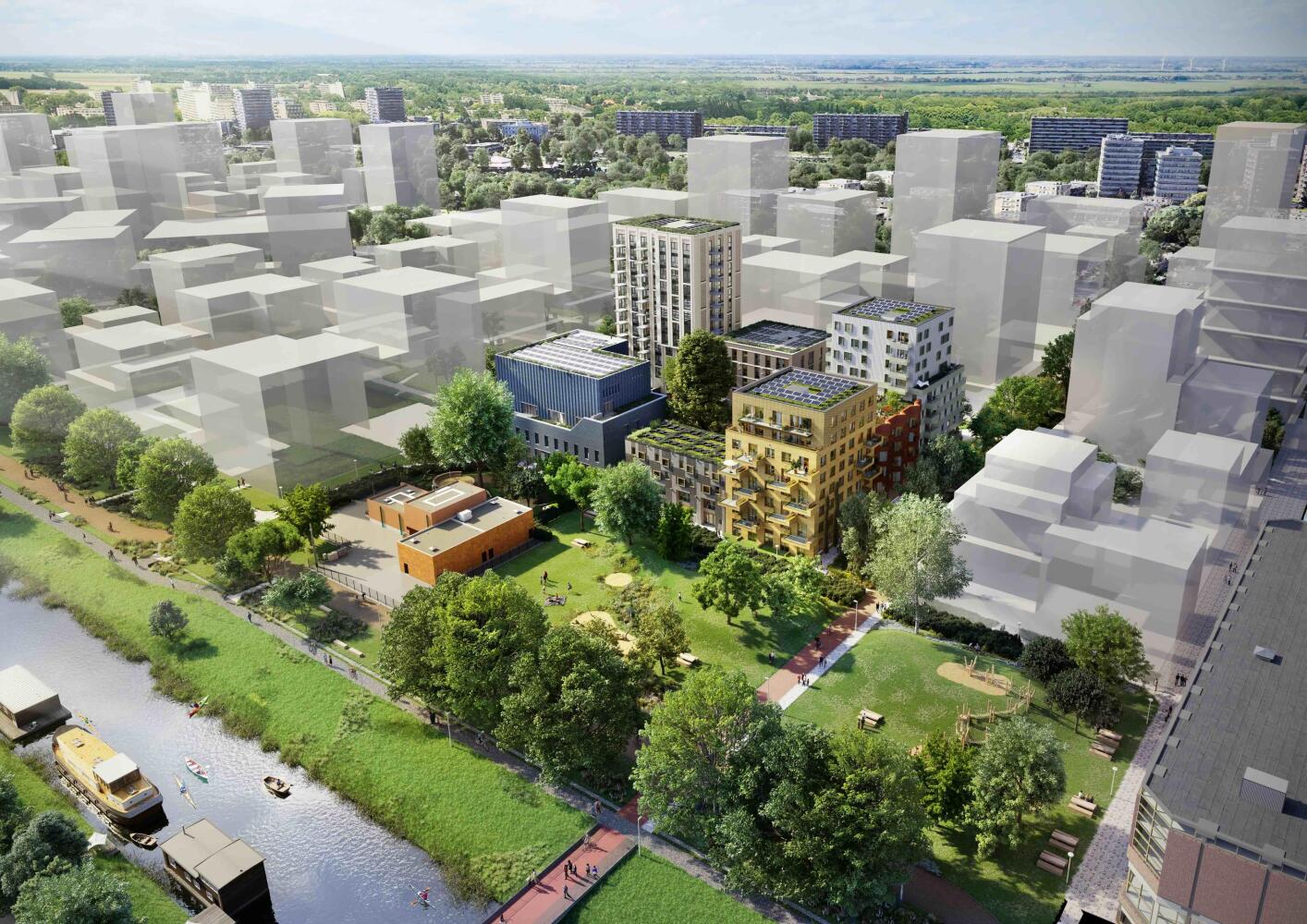 Zodra je de wijk in fietst maakt het geluid van ronkende auto’s plaats voor fluitende vogels. Geniet in het zonnetje in het park uitkijkend over het water, waar plezierbootjes en kanoërs langsvaren. Of met een drankje op één van de terrassen vlakbij. Onderweg naar je herenhuis of appartement ontmoet je je buren in een groene binnentuin of op een gezellig plein, haal je je kinderen van school of loop je een rondje langs het groene dwaalspoor, het hart van de wijk.