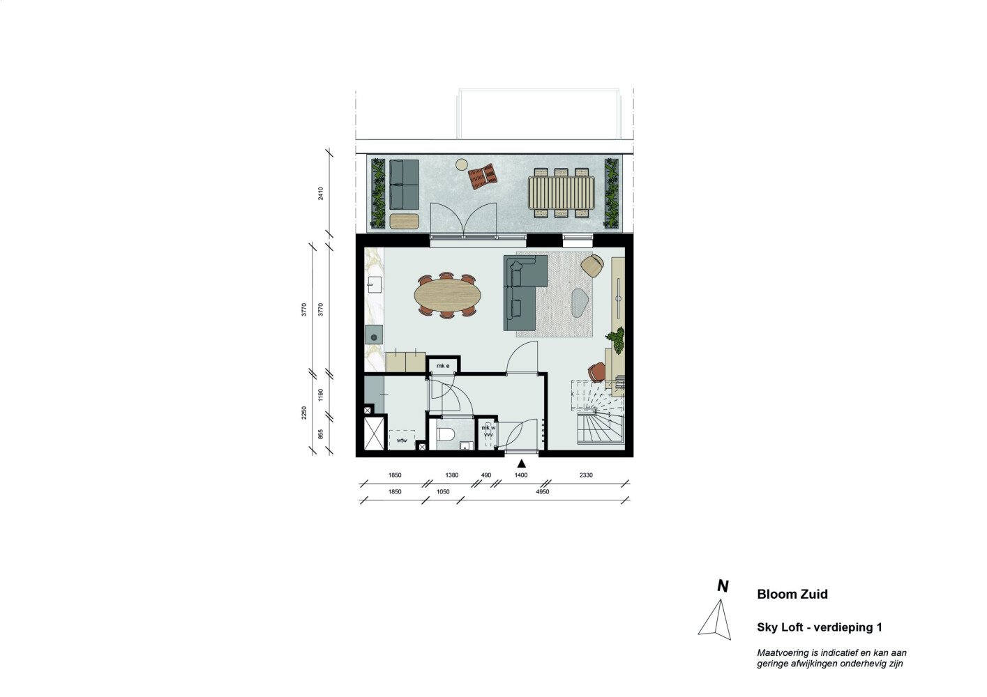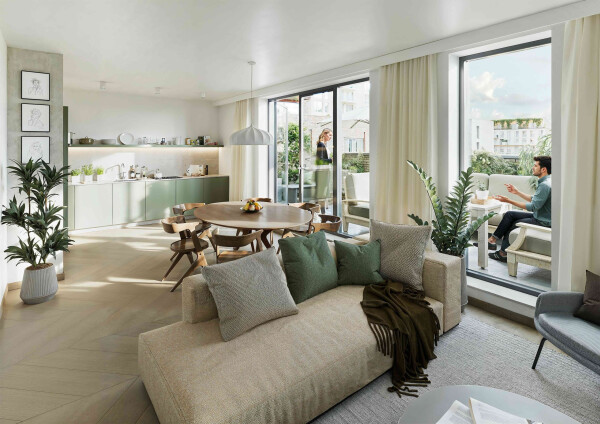 Deze tweelaagse maisonnette, verdeeld over de vijfde en zesde verdieping, heeft een echte loft-uitstraling en verrassend veel buitenruimte. Met 101 m² woon je hier licht en comfortabel. Beneden speelt het dagelijks leven zich af: borrelen, lang tafelen en relaxed op de bank ploffen. De leefkeuken maakt van koken vanzelf een sociaal moment, terwijl de grote ramen en het groen buiten zorgen voor een fijne, open sfeer. En praktisch is de Sky Loft ook: er is een inpandige berging met plek voor extra opslag én aansluitingen voor wasmachine en droger.