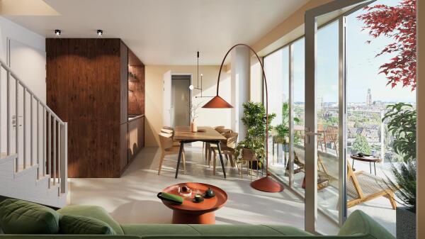 Een highlight: het riante terras. Met een oppervlakte van circa 30 tot 37 m², vormt het een volwaardig verlengstuk van de woonruimte. Er is plek voor een grote eettafel, groen en lange zomeravonden buiten. Dankzij de grote glaspartijen in dit sfeervolle terrasappartement lopen binnen en buiten hier naadloos in elkaar over. Met volop licht en weids zicht op de stad.