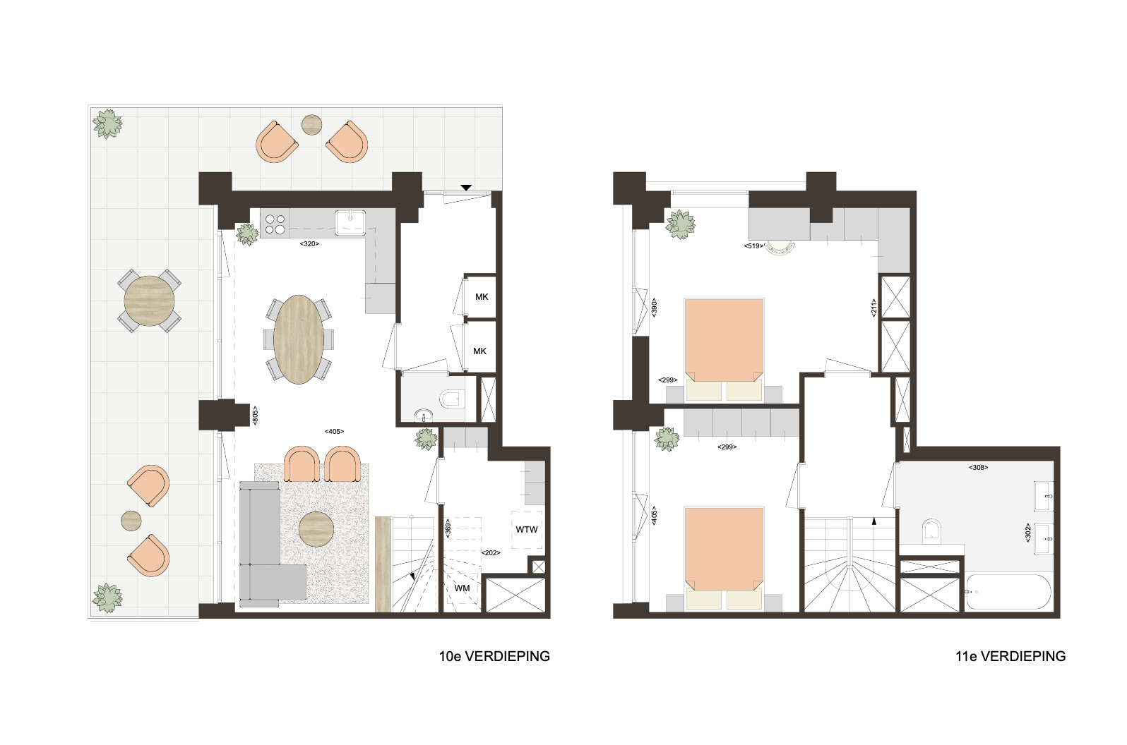 Een highlight: het riante terras. Met een oppervlakte van circa 30 tot 37 m², vormt het een volwaardig verlengstuk van de woonruimte. Er is plek voor een grote eettafel, groen en lange zomeravonden buiten. Dankzij de grote glaspartijen in dit sfeervolle terrasappartement lopen binnen en buiten hier naadloos in elkaar over. Met volop licht en weids zicht op de stad.