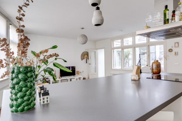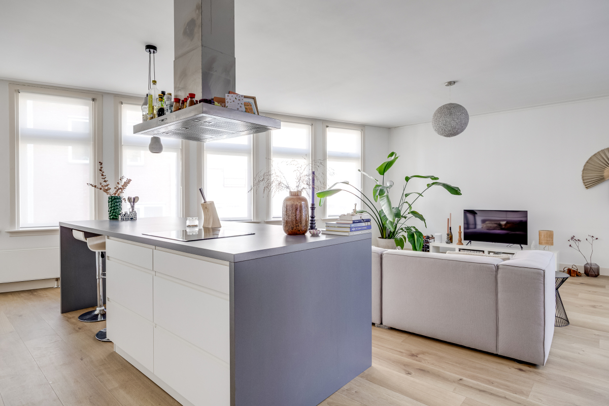 De royale woonkamer wordt gekenmerkt door veel daglicht dankzij grote raampartijen. De open leefkeuken vormt het hart van het appartement: stijlvol, modern en klaar voor lange avonden koken, borrelen en genieten samen of met vrienden en familie.