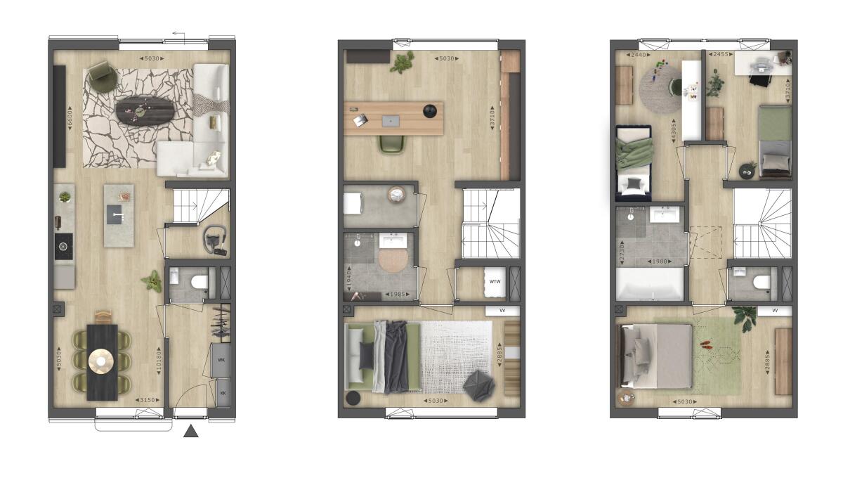 De vijf ruimte stadswoningen van 152 / 153m² zijn voorzien van vier slaapkamers, een werkkamer, twee badkamers en een buitenruimte gelegen op het westen. De koopsommen van deze woningen variëren tussen € 990.000 - € 995.000 v.o.n.