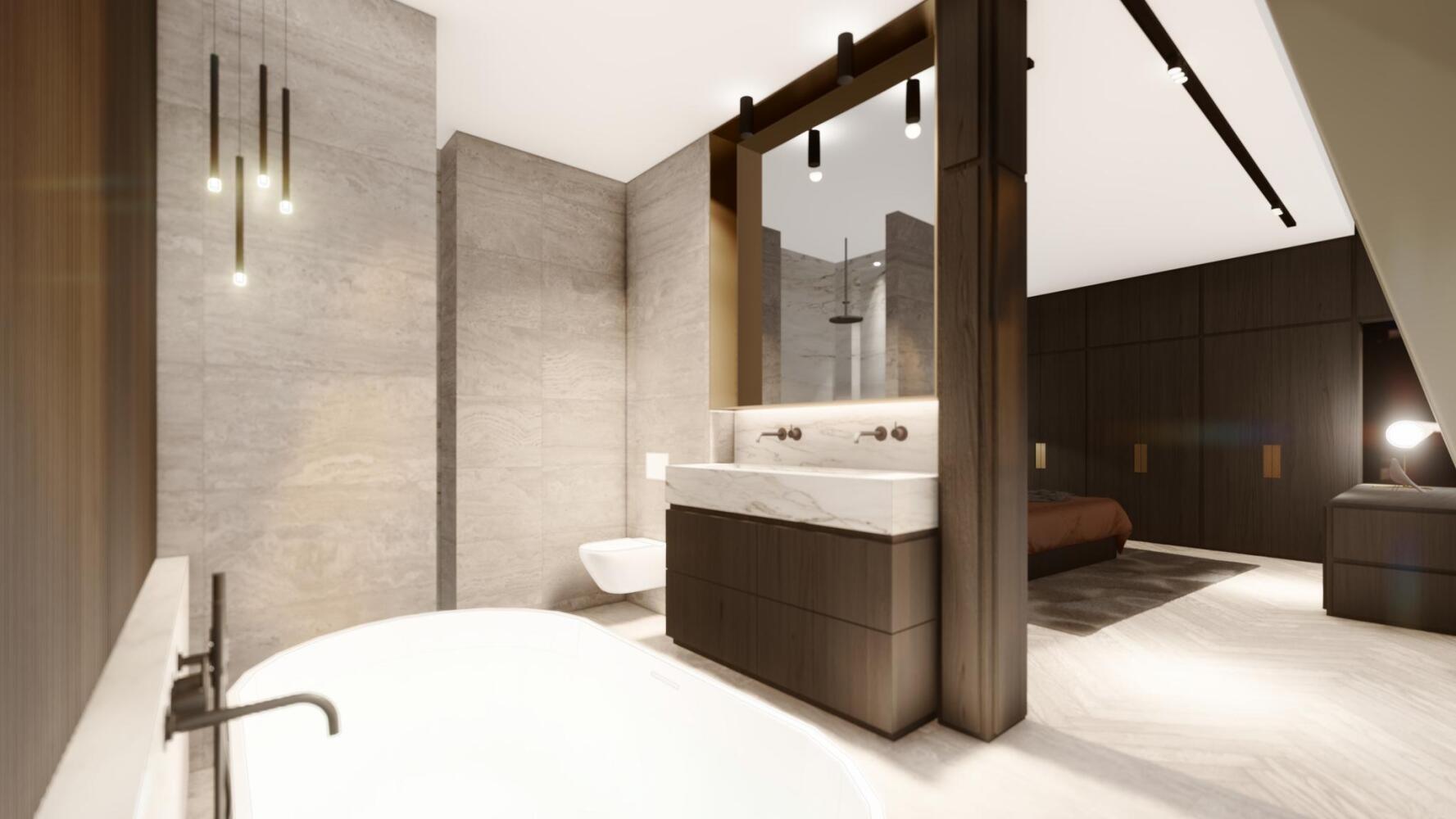 - 1 Masterbedroom met eigen badkamer voorzien van ligbad en inloopdouche. Tevens heb je mogelijkheid om een ruime inloopkast te creëren