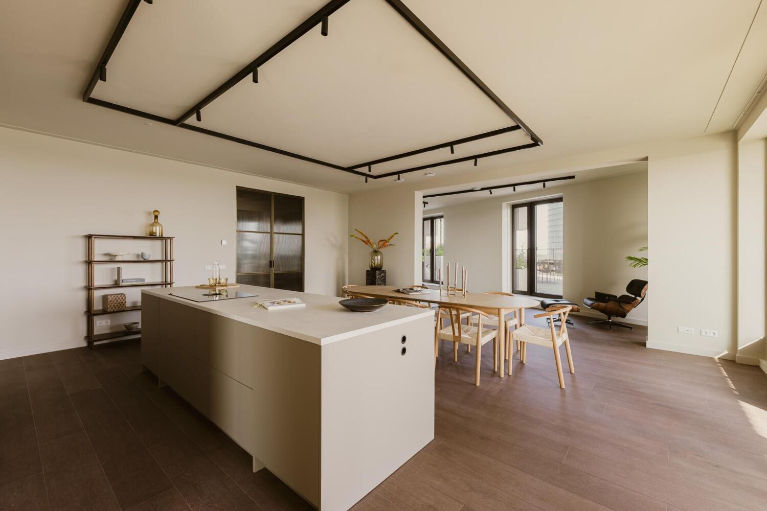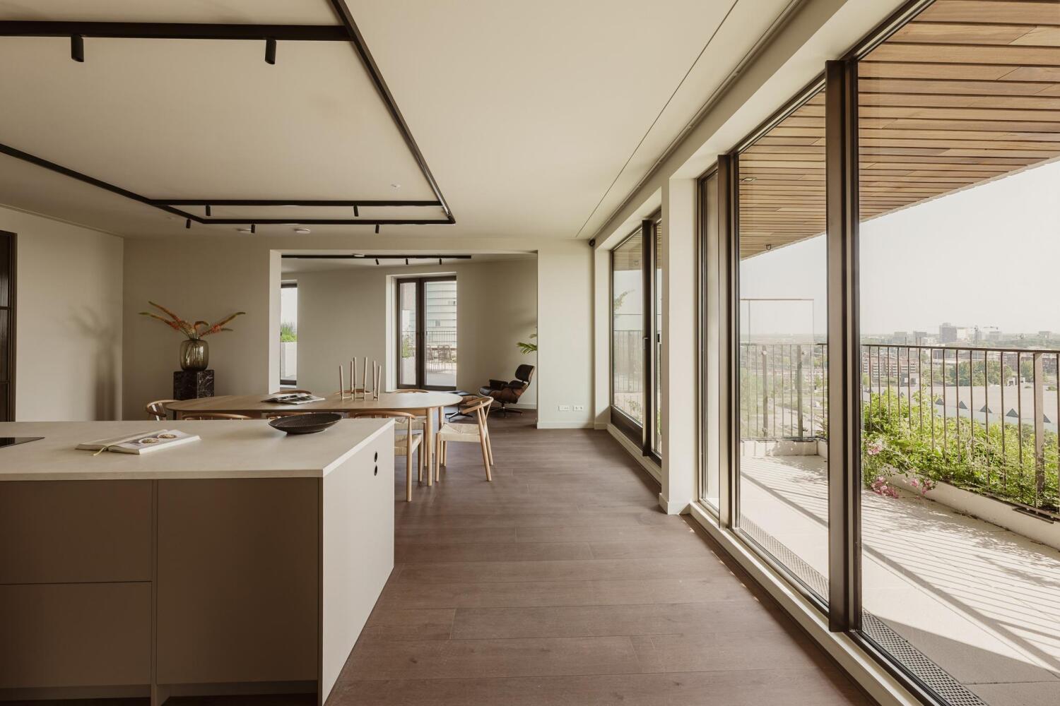 Het appartement betreed je binnen via de ruime ontvangsthal welke zijn voorzien van dubbele stalen deuren met bronzen profielen die toegang geven tot de woonkeuken. In de hal vind je diverse praktische voorzieningen zoals een garderobe, toilet, berging en technische ruimte. De riante eetkeuken met een groot keukeneiland en fijn balkon met een prachtig uitzicht over Utrecht zorgt voor een echt thuisgevoel. Links van de keuken tref je een additionele ruimte waar je bijvoorbeeld een sfeervolle lounge of werkplek, of bijvoorbeeld een lichte tuinkamer kan worden gerealiseerd. Vanaf hier betreed je het riante terras. De aan de keuken grenzende royale living, eveneens voorzien van een balkon, is het perfecte toevluchtsoord voor ontspanning. Deze is tevens voorzien van een ruime berging, de ideale plek voor een bijkeuken. De absolute eye-catcher van deze verdieping is toch wel de naadloos gerealiseerde stalen trap die je leidt naar de tweede verdieping waar zich de slaapvertrekken en recreatieruimtes bevinden.