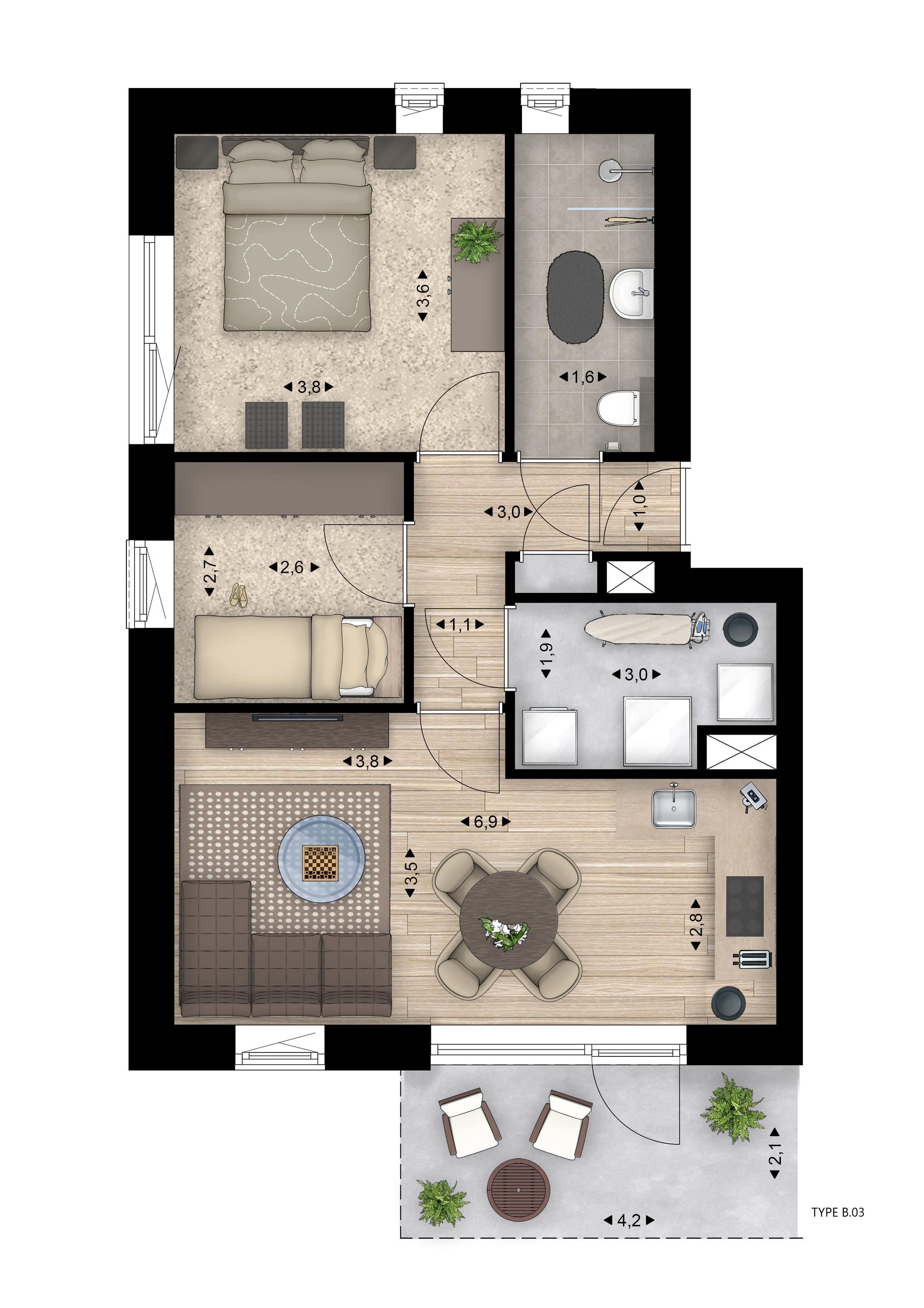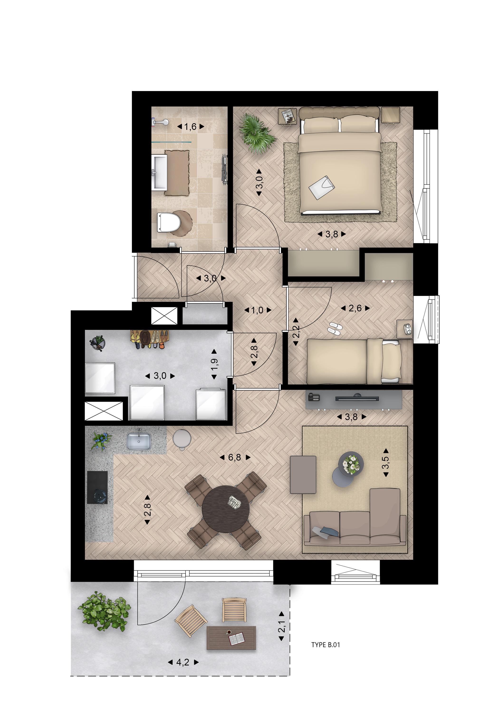 In het midden van het complex zijn per bouwlaag twee tussenappartementen gelegen. Op de begane grond type B.02 met een woonoppervlakte van circa 59 m². Dit compacte maar complete appartement is voorzien van een ruime slaapkamer, een volledig betegelde en ingerichte badkamer met (inloop)douche, wastafel, toilet en elektrische designradiator. De woonkamer met open keuken is een gezellige leefruimte en biedt tevens toegang tot het terras, fraai gelegen aan het centrale park en met een groene haag als afscherming. Vanuit de woonkamer is ook de inpandige berging met de technische installaties en witgoedaansluitingen te bereiken.