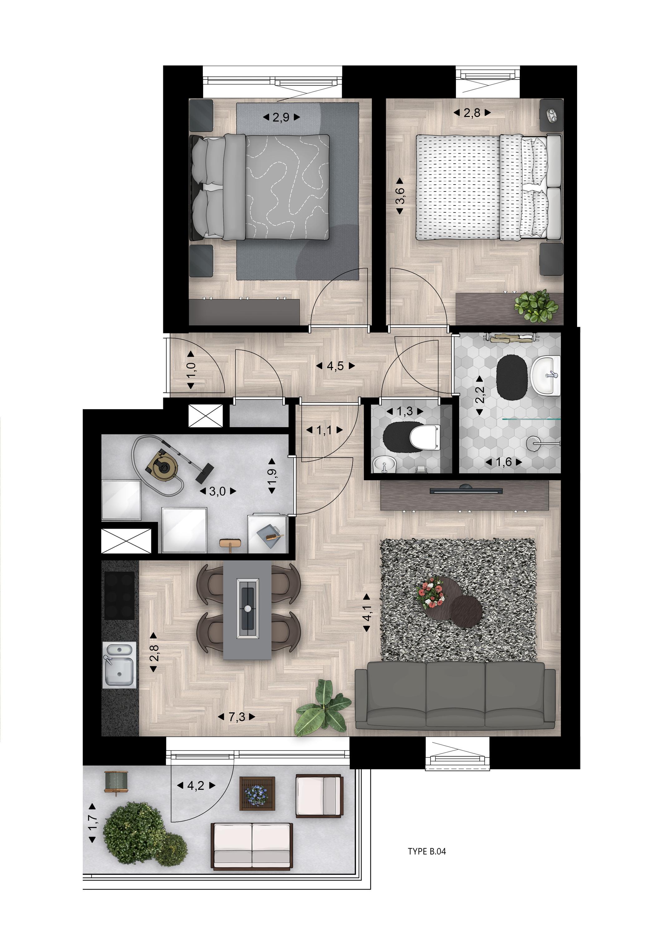 Deze fraaie hoekappartementen type B.01 en B.03 zijn gelegen op alle bouwlagen van het complex (begane grond, 1e verdieping en 2e verdieping). Type B.01 is circa 59 m² groot en type B.03 circa 63 m². De woningen zijn voorzien van twee slaapkamers, een volledig betegelde en ingerichte badkamer met (inloop)douche, wastafel, toilet en elektrische designradiator. De hal biedt tevens toegang tot de inpandige bergruimte, waar de technische installaties en witgoedaansluitingen zijn gesitueerd. De woonkamer met open keuken is een gezellige leefruimte met veel lichtinval. Vanuit de keuken/eethoek is het terras (begane grond) of balkon (1e en 2e verdieping) te bereiken, met fraai uitzicht op het centrale park. Tussen de terrassen op de begane grond wordt een fraaie haag voorzien, op de balkons op de verdiepingen een ondoorzichtig privacyscherm.