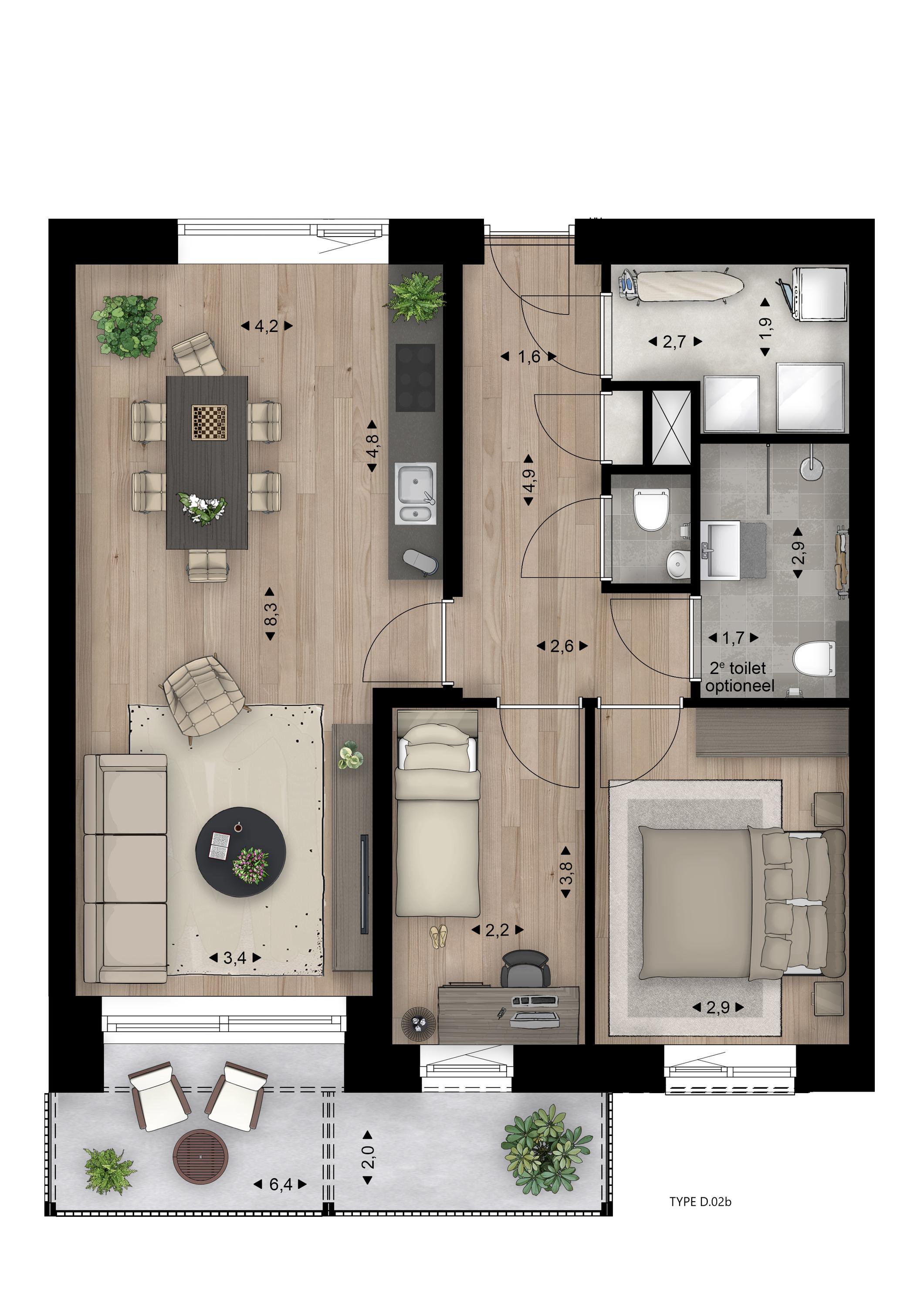 De fraaie hoekappartementen type D.01 en D.03 zijn op zowel de begane grond als alle verdiepingen gelegen. Type D.01 is het grootste appartement en circa 78 m² groot. Type D.03 is met circa circa 69 m² wat compacter, maar nét zo compleet en ligt minstens zo mooi aan de zonnige zuidkant van het complex. De woningen zijn allemaal voorzien van twee slaapkamers, een volledig betegelde en ingerichte badkamer met (inloop)douche, wastafel en elektrische designradiator. De hal biedt tevens toegang tot een separaat toilet met fonteintje en de inpandige bergruimte, waar de technische installaties en witgoedaansluitingen zijn gesitueerd.