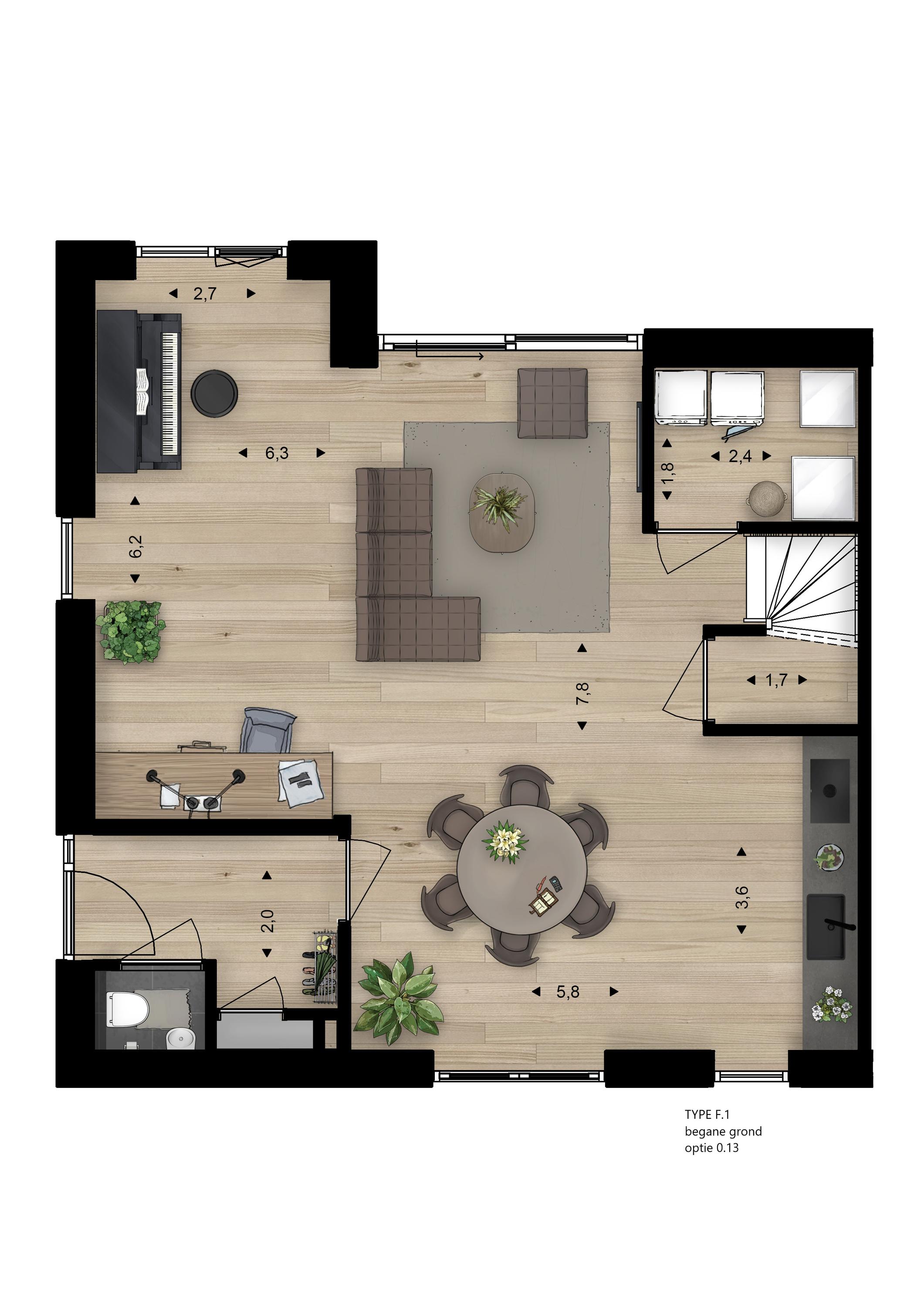 De levensloopbestendige hoekwoningen type E-1 komt u binnen op de kop van het bouwblok. Via de hal, waar ook de meterkast, garderoberuimte en toilet zijn gelegen, stapt u de royale woonruimte binnen. Aan de voorzijde een grote leefkeuken met openslaande deuren naar de unieke houten veranda aan de parkzijde. Aan de achterzijde, meer intiem en rustig gelegen aan de privé achtertuin, het zitgedeelte en toegang tot de slaapkamer met en-suite badkamer. Een kleine berging met technische installaties en witgoed aansluitingen is eveneens op de begane grond gelegen. Onder de semi-open trap naar de 1e verdieping bevindt zich nog een handige trapkast.
