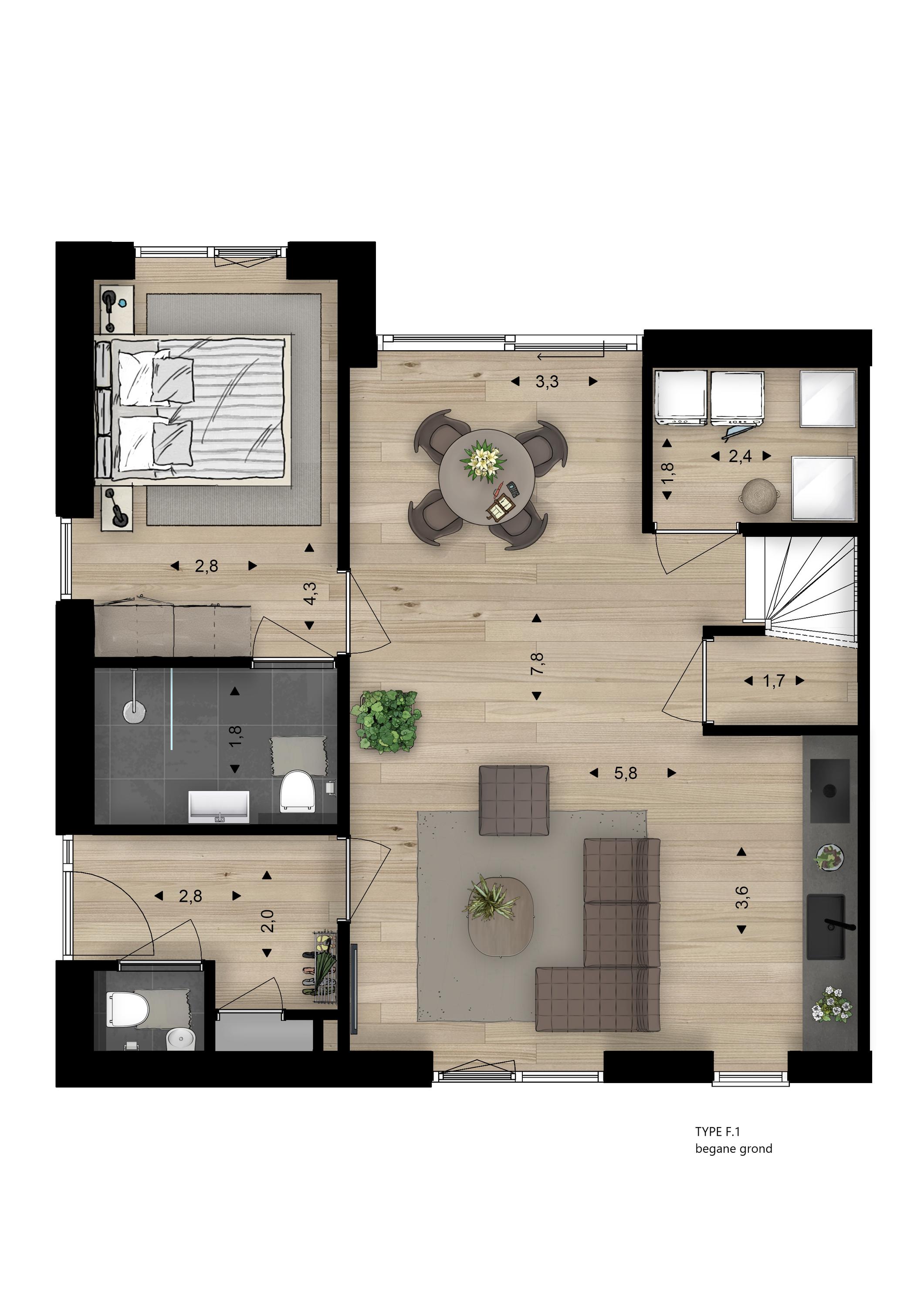 Aan het pad naar de Eindstraat is nóg een levensloopbestendig bouwblok gelegen, type F. Heerlijk rustig gelegen aan een hofje, met de Grote Kerk op de achtergrond. Dit is als het ware een levensloopbestendige tweekapper met privé achtertuin en met dezelfde indeling als de hoekwoningen van e verandawoningen type E. Het verschil met type E is dat deze woningen geen veranda hebben; hier geniet je van een optimale groenbeleving met de bestaande monumentale beukenbomen in de voortuin!