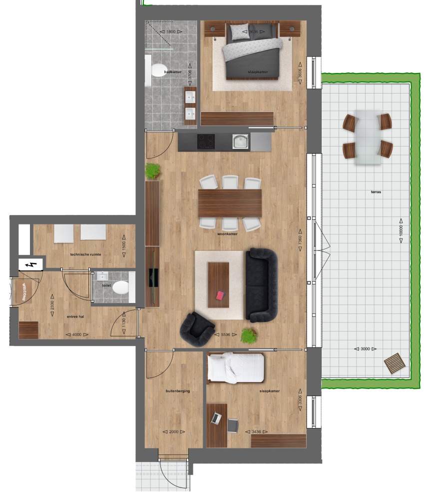 - Woonklaar! Standaard wordt de woning voorzien van wandafwerking, vloerafwerking en raambekleding