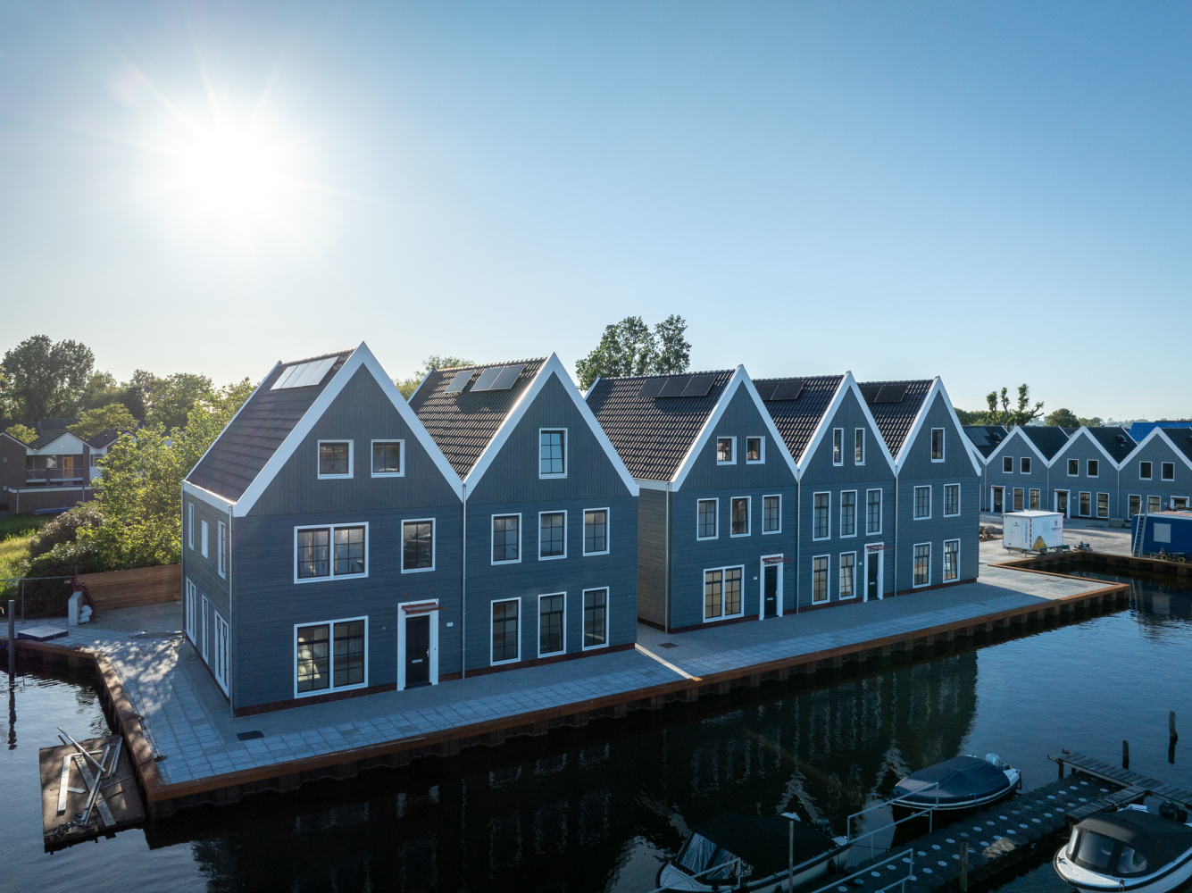 Het zadeldak boven de tweede verdieping wordt benut voor zonnepanelen, een duurzame ondersteuning van de externe energiebehoefte die door het vernuft van de warmtepomp al bijzonder laag is. Het plein ligt in alle openheid aan de kade, met in het midden een plantsoen.