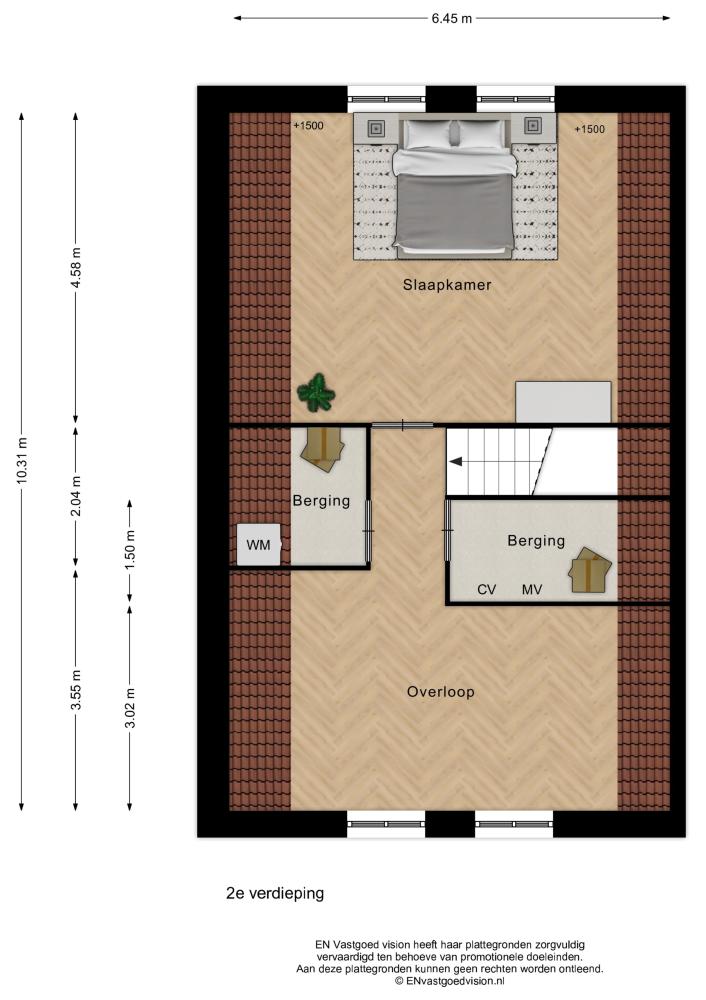 2e Verdieping: overloop. Vierde slaapkamer aan tuinzijde. Berging met aansluitingen voor wasmachine en -droger. Technische berging met installaties. Ruimte naar eigen zeggen in te richten met Zaanzicht. Volledige nokhoogte.