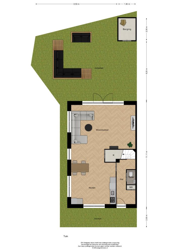 Entree halfvrijstaande kadewoning. Hal met garderobe en meterkast. Toiletruimte met wandcloset en fontein. Trapopgang. L-vormige doorzon woonkamer met open leefkeuken (casco op te leveren). Lichtinval van drie kanten. Gevelhoge raampartijen met dubbele openslaande deuren naar beschutte achtertuin op het westen en zuiden. Houten berging, voorzien van elektra.