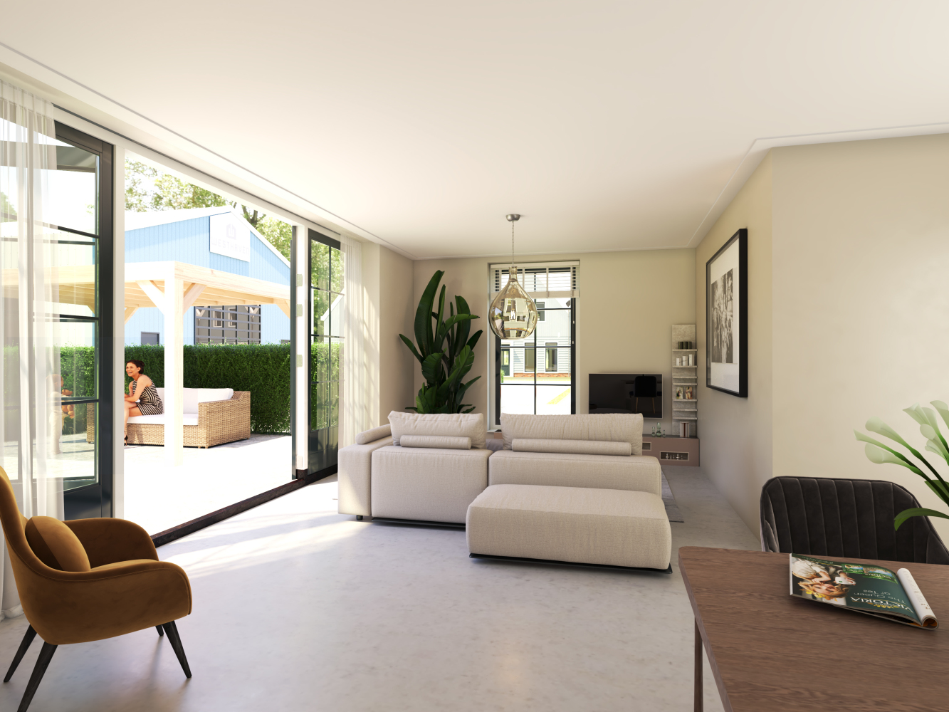 De kadewoningen beschikken over een L-vormige woonkamer waarin aan de pleinkant ruimte wordt voorzien voor een keuken. Die wordt casco opgeleverd en kan naar eigen behoeften en wensen worden ingevuld. De vensters beginnen al direct boven de gemetselde borstwering waardoor de lichtinval van deze kant optimaal wordt benut. De living richt zich naar de tuin, met gevelhoge raampartijen en dubbele openslaande deuren. Binnen wordt buiten en andersom.