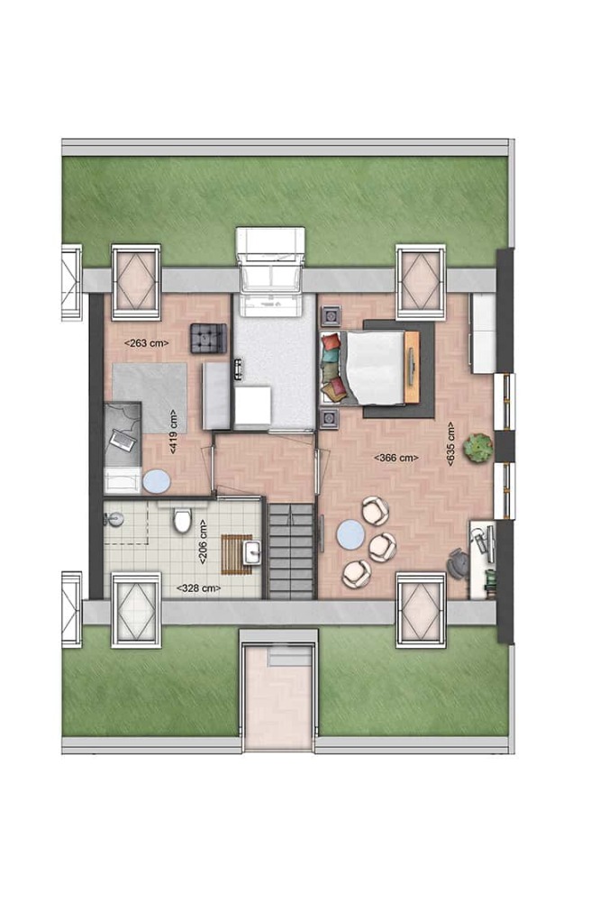 Achteraan het dwarspad ligt een traditioneel met een twist vormgegeven tweekapper. Deze halfvrijstaande woningen hebben rondom tuin. Het mandelige parkeerterrein ligt ernaast. Wat deze woningen extra bijzonder maakt, is de uitstraling. Een mos-sedum dak laat de woningen optisch opgaan in de weidsheid van het landelijke poldergebied. Gecombineerd met de isolerende eigenschappen van dit natuurlijke materiaal bieden deze woningen extra comfort. Maar dat is niet alles, deze woningen krijgen levensloopbestendige karakteristieken mee door de indeling. Naast de twee slaapkamers en badkamer op de verdieping wordt namelijk de begane grond uitgerust met de tweede badkamer en een derde slaapkamer! Deze twee-onder-één-kapwoningen kunnen we door de ligging, locatie, uitrusting én indeling gerust betitelen als het type 'nooit meer weg'...
