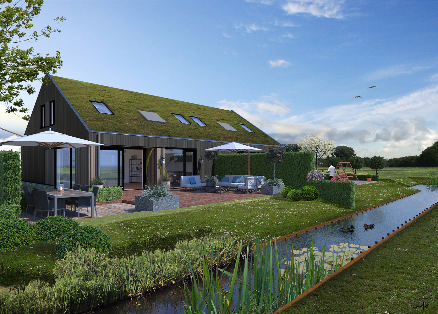 Achteraan het dwarspad ligt een traditioneel met een twist vormgegeven tweekapper. Deze halfvrijstaande woningen hebben rondom tuin. Het mandelige parkeerterrein ligt ernaast. Wat deze woningen extra bijzonder maakt, is de uitstraling. Een mos-sedum dak laat de woningen optisch opgaan in de weidsheid van het landelijke poldergebied. Gecombineerd met de isolerende eigenschappen van dit natuurlijke materiaal bieden deze woningen extra comfort. Maar dat is niet alles, deze woningen krijgen levensloopbestendige karakteristieken mee door de indeling. Naast de twee slaapkamers en badkamer op de verdieping wordt namelijk de begane grond uitgerust met de tweede badkamer en een derde slaapkamer! Deze twee-onder-één-kapwoningen kunnen we door de ligging, locatie, uitrusting én indeling gerust betitelen als het type 'nooit meer weg'...