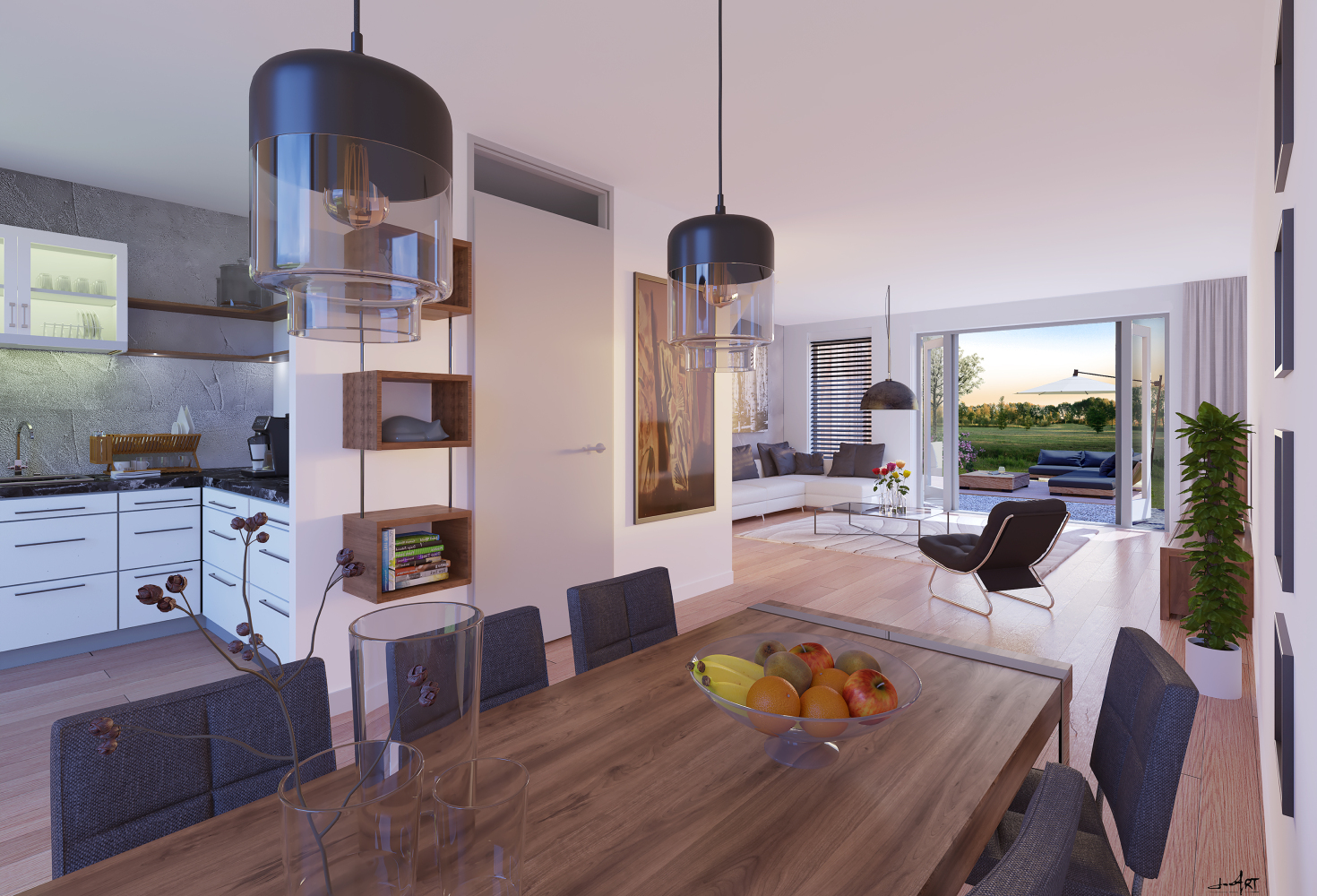 Beneden wordt vrijwel de hele begane grond benut voor wonen. De casco op te leveren leefkeuken heeft zicht op de voortuin en staat in open verbinding met de living aan de achtertuin. Hier leiden dubbele openslaande deuren naar de waterkant.