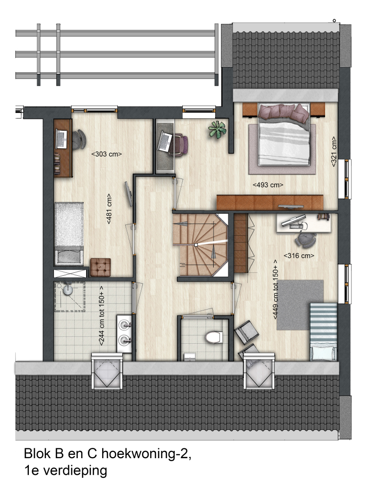 2e Verdieping: bergvliering over de hele woningbreedte. Technische en facilitaire ruimte met aansluitingen warmtepomp en mechanische ventilatie. Ook worden hier de aansluitingen voor wasmachine en -droger geplaatst. Een gevelraam geeft daglicht.